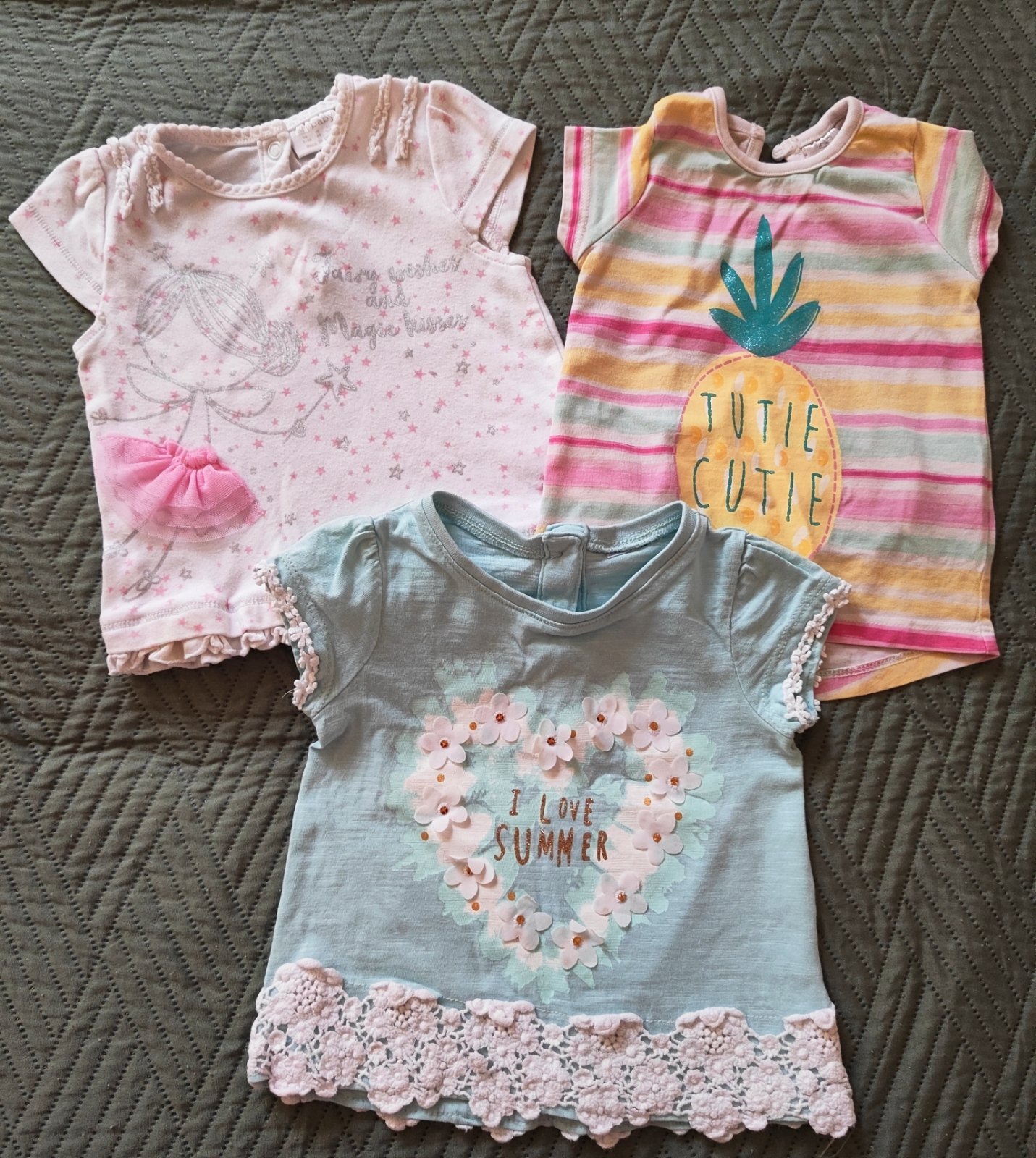 3 trička značky next, sú len opraté nestihli sme ich vynosiť , farby ružové, biele a lososové , veľkosť je písaná 3-6 mes.100%bavlna, predaj spolu