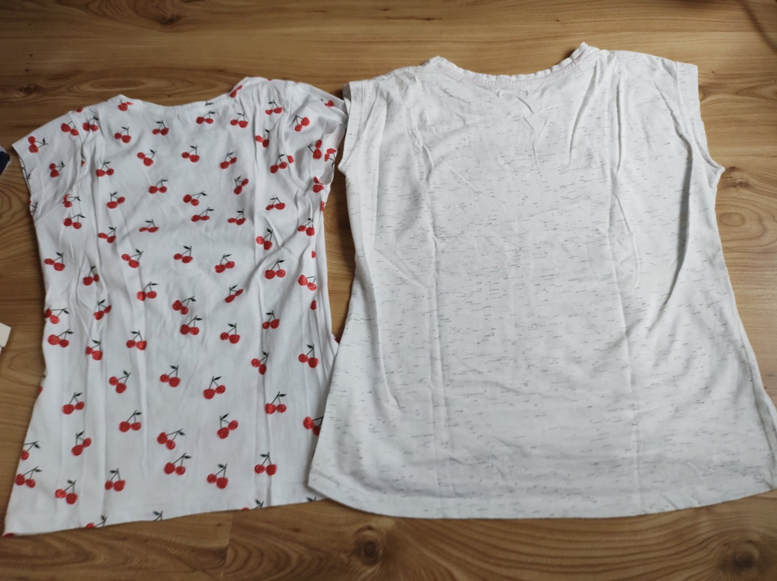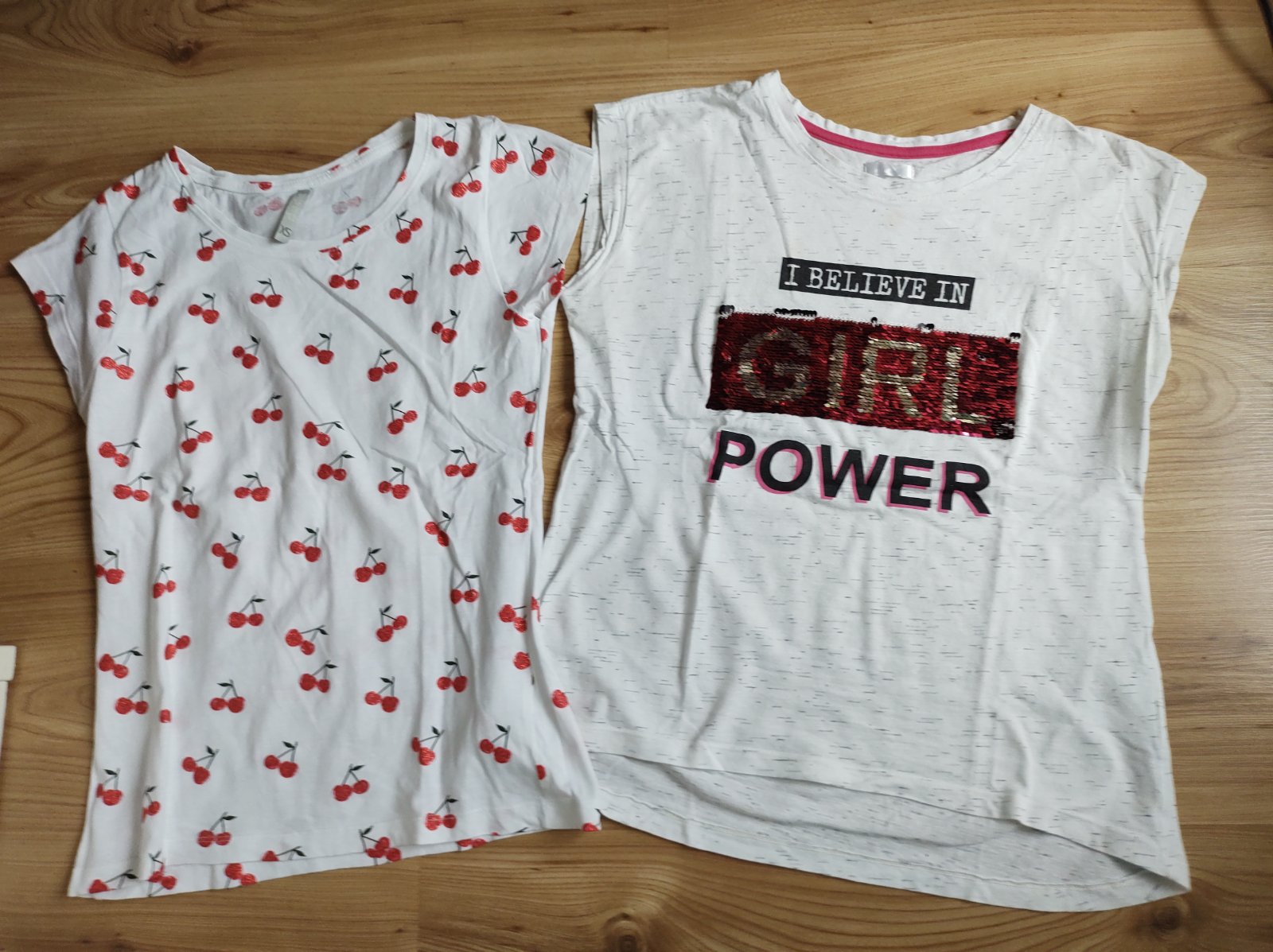 Ponúkam na predaj zachovalé tričká, ako nové, TOP STAV. Rozmery tričko s potlač. čerešní: Šírka 2 x 41 cm, dĺžka 54 cm, tričko s flitrami: Šírka 2 x 38 cm, dĺžka 52 cm, 100% BA. Bez poškodení. Cena za obe 6 €. Zvlášť 4 €/ks