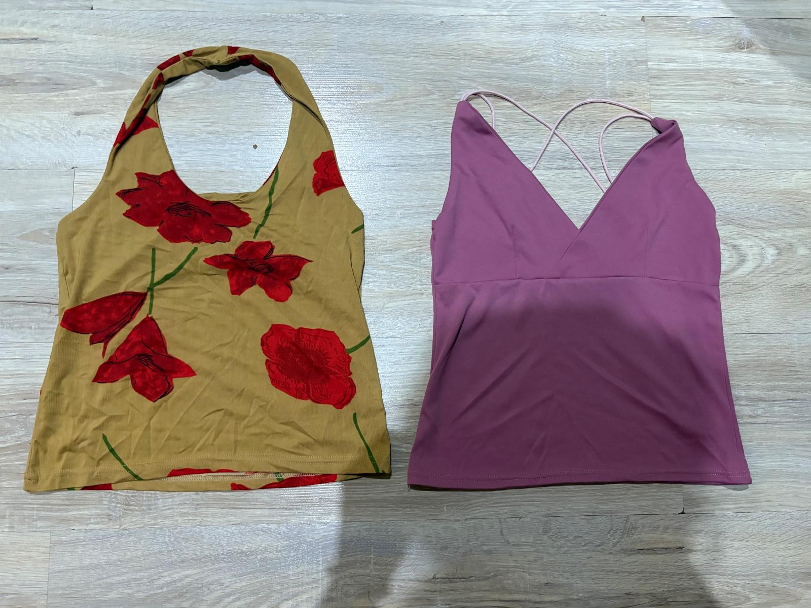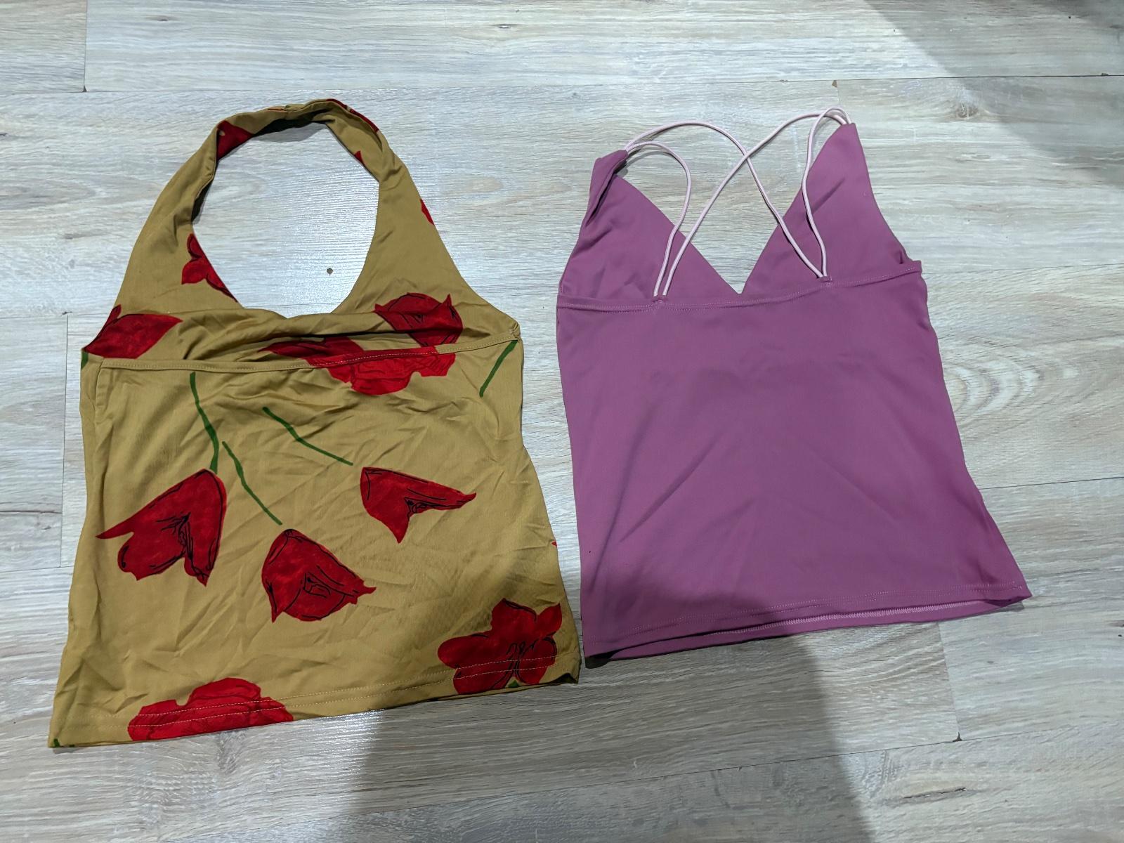 Darujem ku nakupu podľa svojho vyberu pekne tricka 1foto;kvetinove okolo krku ok stav celkova dlzka31,2cm,sirka38cm..e2 he je ok stav len v predu par zmoliniek nic hrozne celkova dlzka30,2cm,od ramienok47,3cm..sirka36cm..posta1,40obycajne moj skr spa dol krab