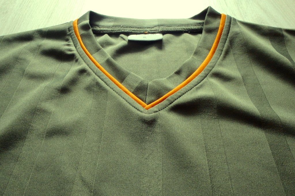 Má véčkový výstrih. Výstrih aj rukávy sú lemované oranžovým pásikom.