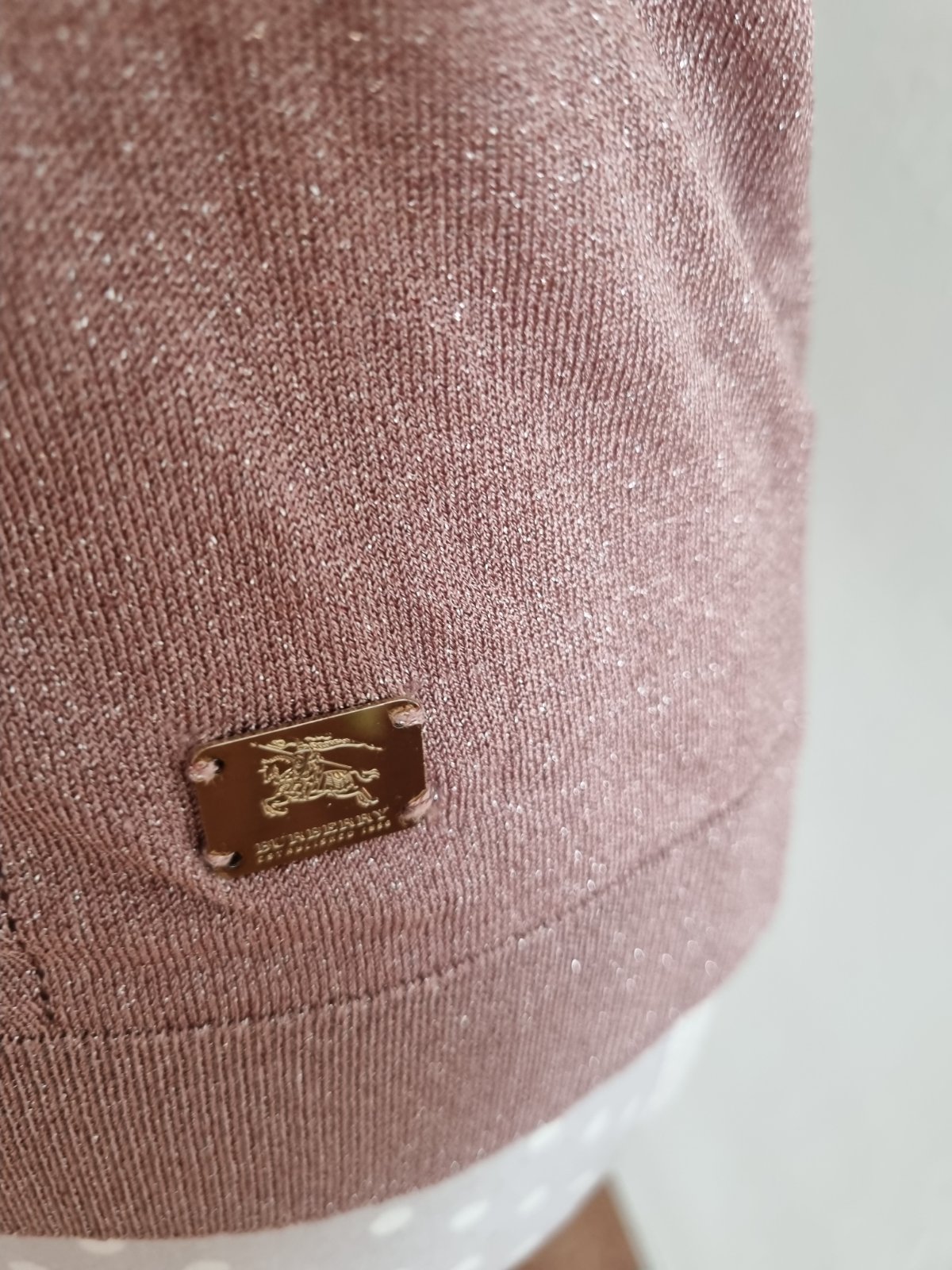 1x oblečený pleteninkový tenký staroružový top so strieborným vláknom BURBERRY, originál viď logo, štítok, len vnútorná štítok bol veľký je vystrihnutý, krásny, píše 42, sedí na M, dlžka 56, prsia 48x2 v kľude, ešte pustí...najkrajšie ukáže na veľkosti 40..pekne sa natiahne.....ja som 38 a je mi veľký...