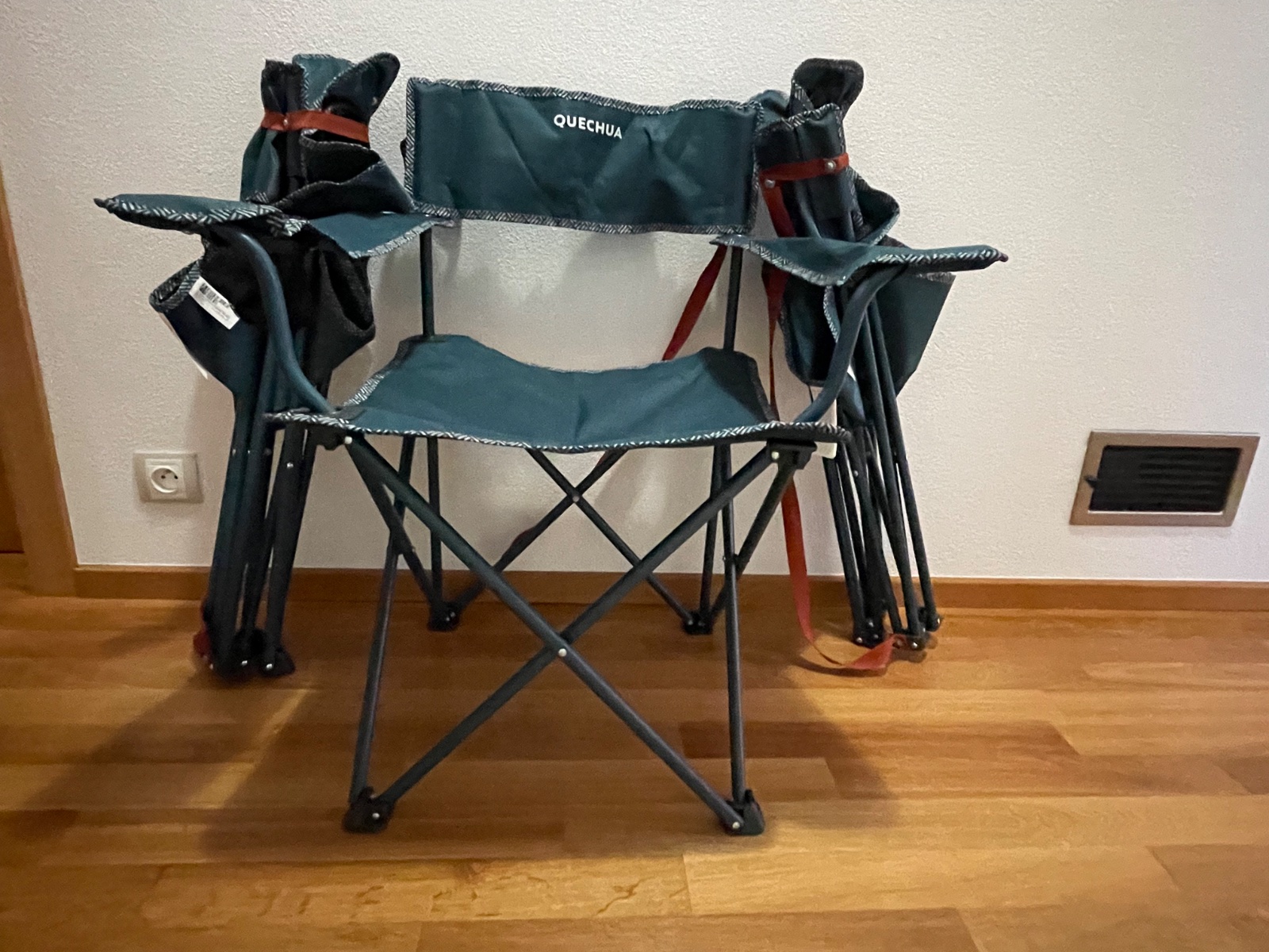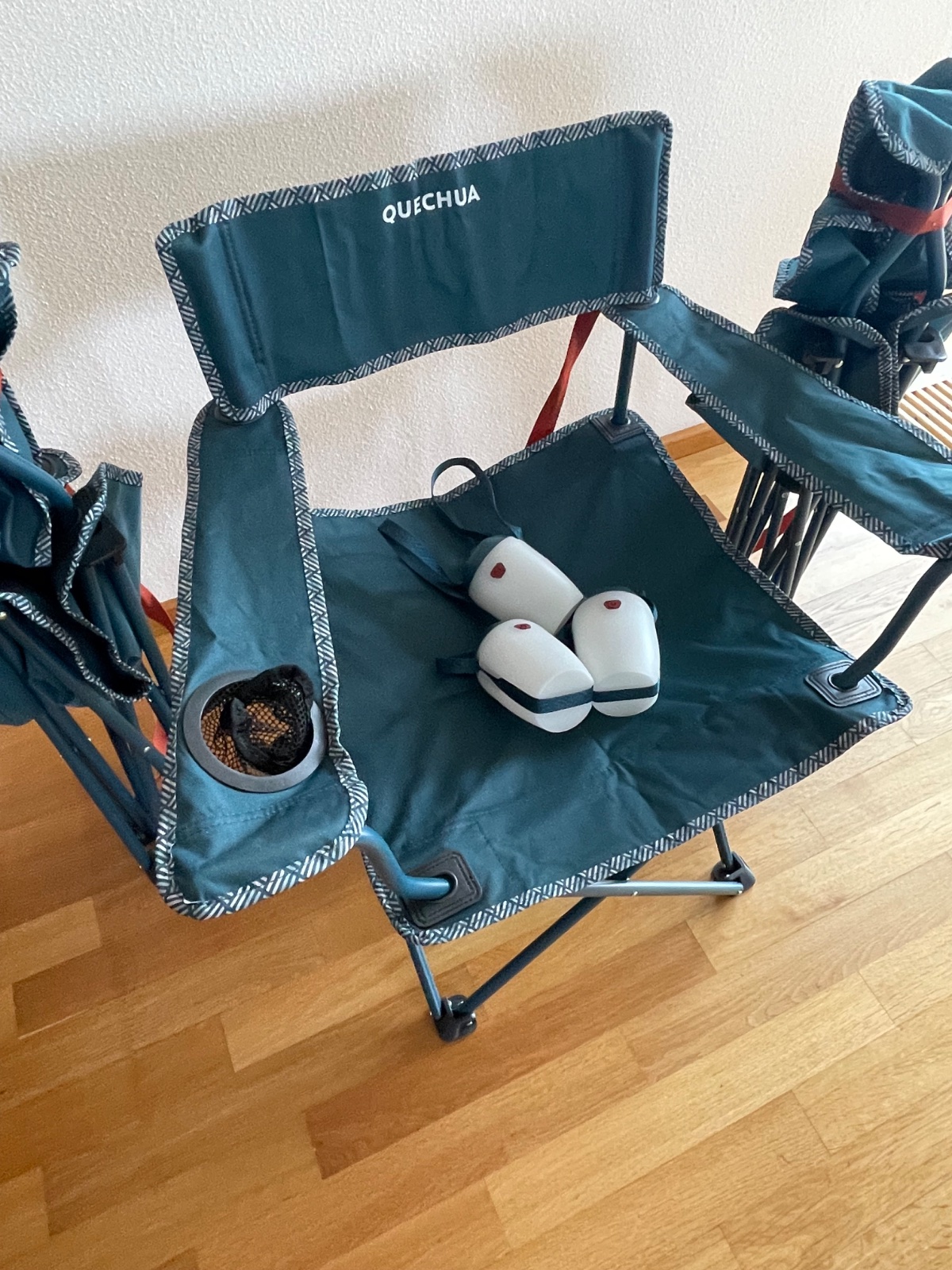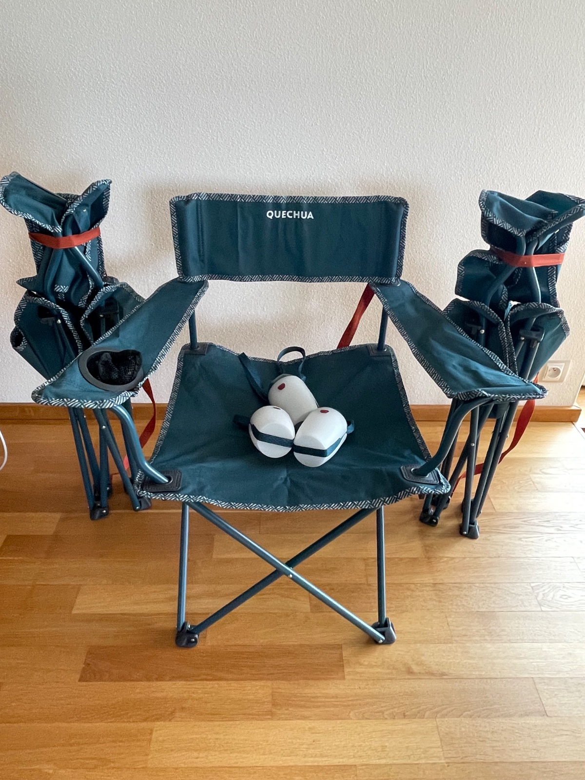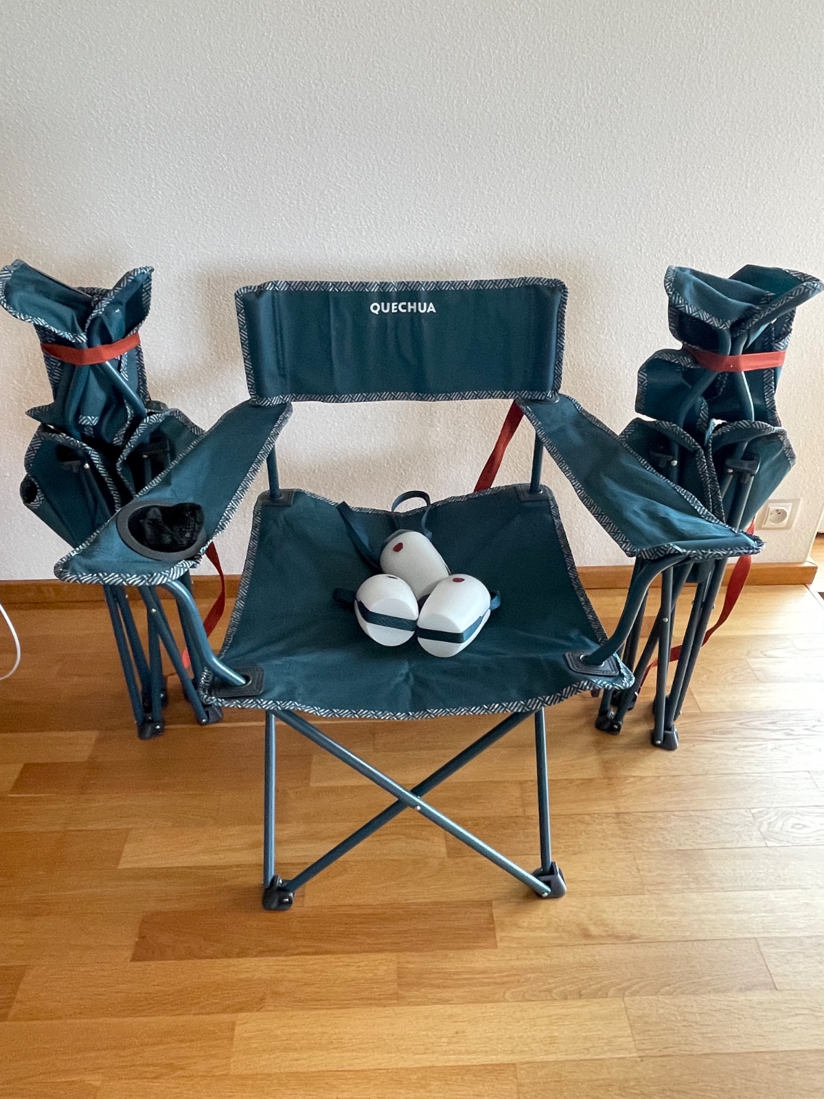 Ponúkame 3 ks kempovacích skladacích stoličiek v 100% stave požité 1 deň bez poškodenia, ako nové a k tomu 3 ks kempovacích svetiel. Stoličky majú 2 lakťové opierky, 1 držiak na pohár, výška sedacej časti je 41 cm. Stolička má popruh na prenášanie a nosenie, celková hmotnosť je 2,8 kg. Maximána nosnosť stoličky je 110 kg. Veľmi ľahko sa rozkladá.