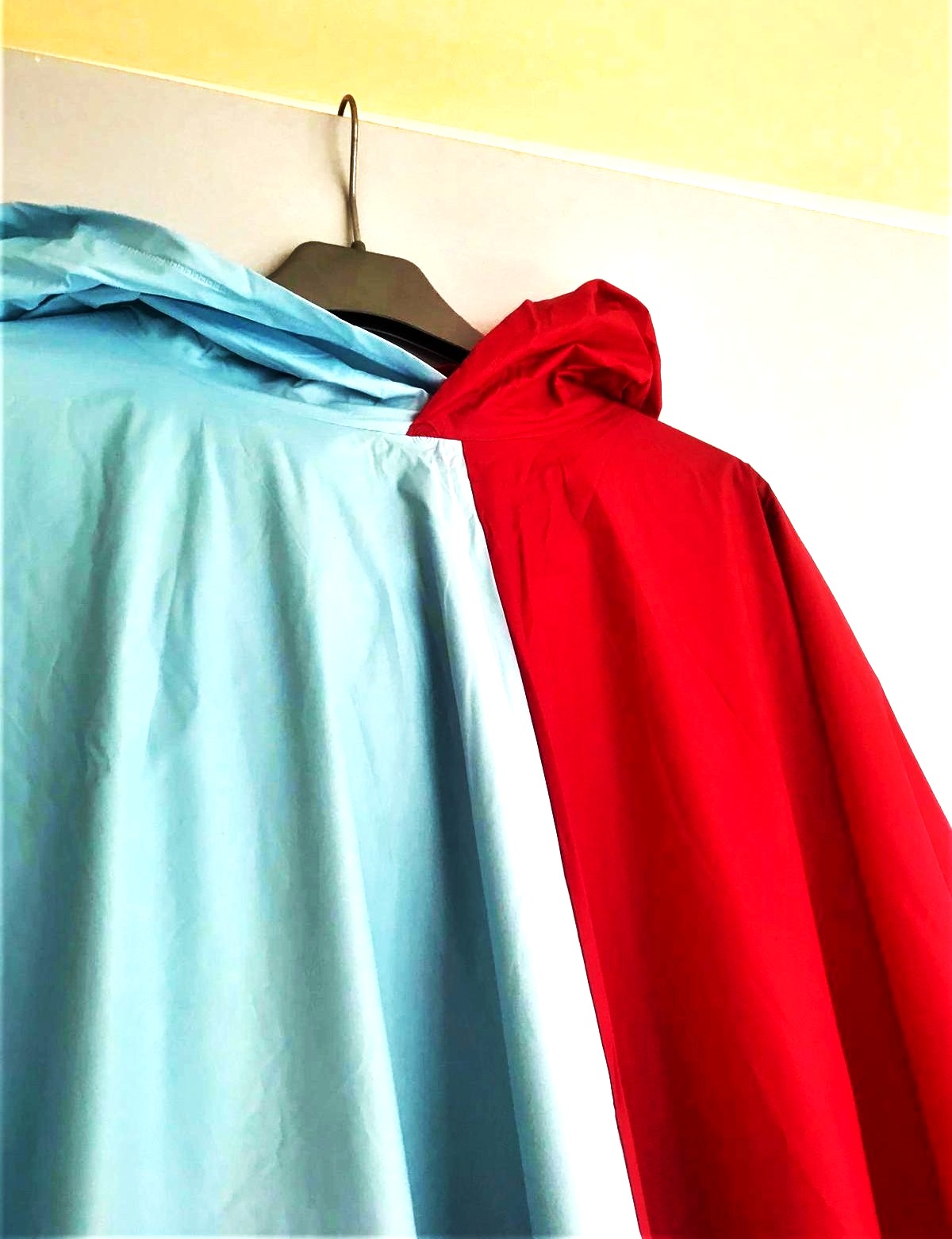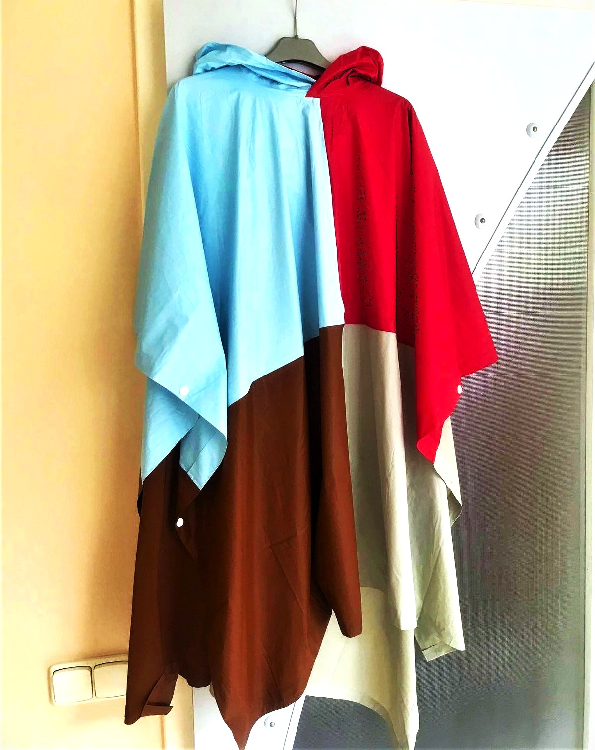 hrubší veľký pršiplášť,s kapucňou,skladný,ľahký,super na festivaly,turistiku,a iné športy,na boku sa upína cvokami, je dostatočne veľký a široký,takže vhodný i na prekrytie batožiny na chrbáte, dlžka od krku smerom na koniec rukáva = 99 cm, šírka na spodku - 130 cm x 2,na posl. fotke je vidno nepatrné fliačky,ale voľným okom to nie je vôbec vidno,ale upozorňujem