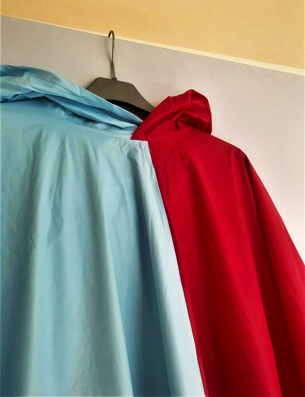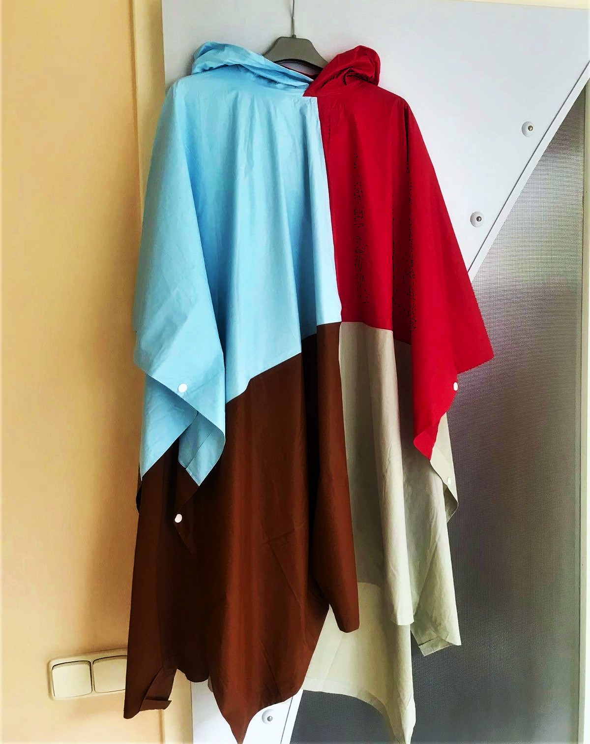 hrubší veľký pršiplášť,s kapucňou,skladný,ľahký,super na festivaly,turistiku,a iné športy,na boku sa upína cvokami, je dostatočne veľký a široký,takže vhodný i na prekrytie batožiny na chrbáte, dlžka od krku smerom na koniec rukáva = 99 cm, šírka na spodku - 130 cm x 2,na posl. fotke je vidno nepatrné fliačky,ale voľným okom to nie je vôbec vidno,ale upozorňujem