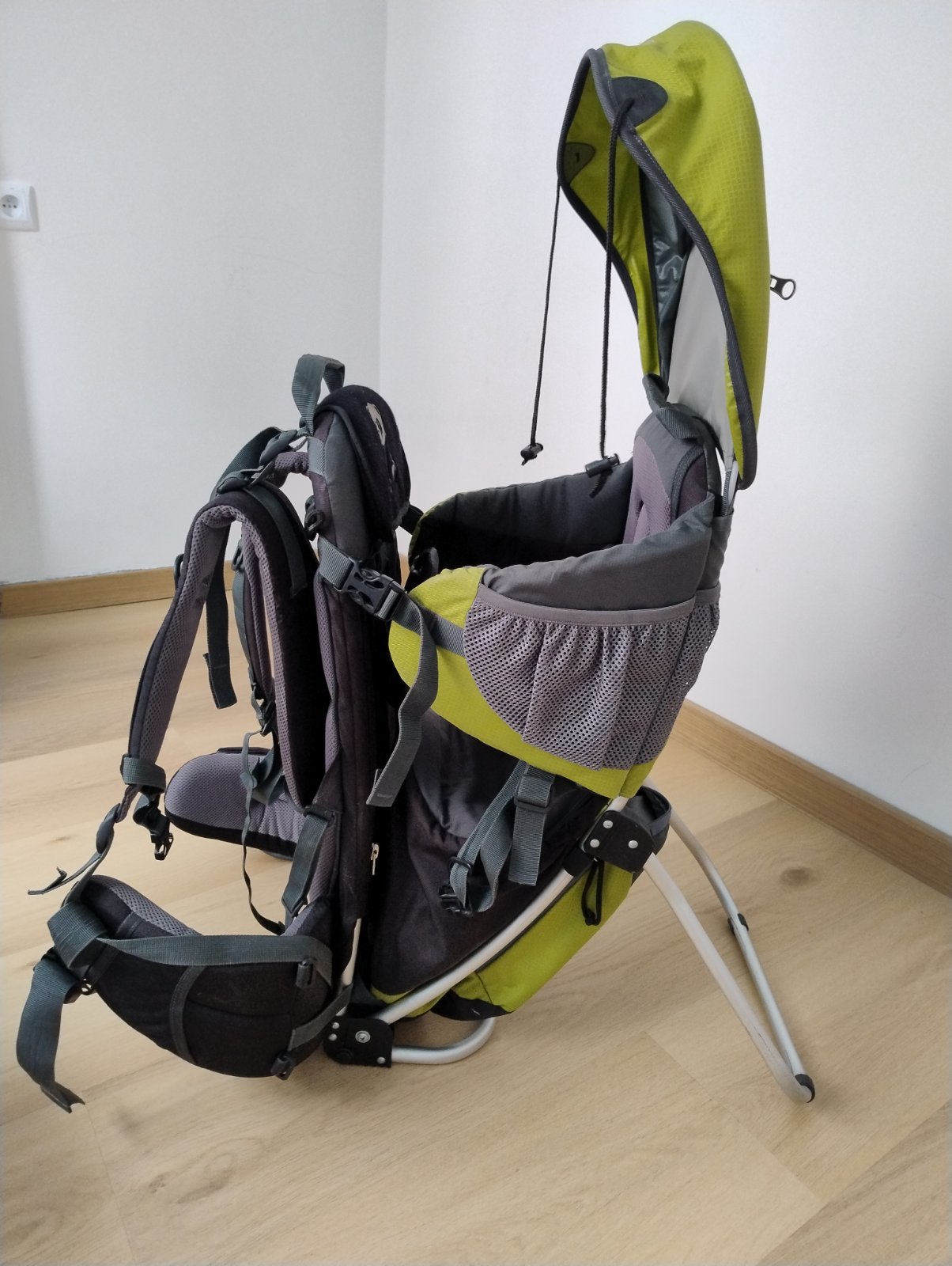 Veľký hlavný úložný priestor pod sediacim dieťaťom, tri ďalšie vrecká, bočné sieťované vrecká, sieťované vrecko na hydratačný systém a odnímateľné vrecko na bedrovom páse.
