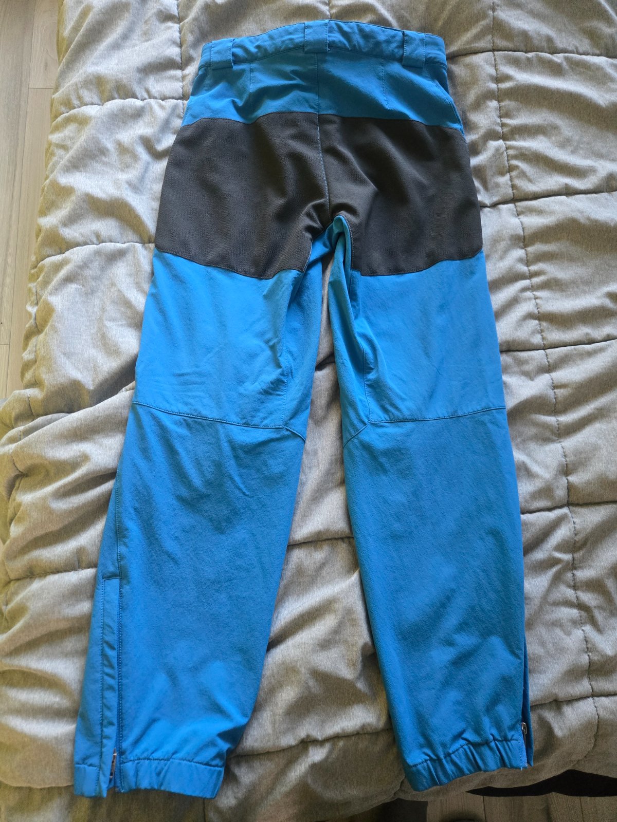 Predám turistické nohavice v 100% stave po jednom dietati. Nepremokave, neprefúka ich, z vnútornej strany jemne zateplené. na páse sťahovacia guma, na spodu nohavíc bočné zipsy kolená a zadok sú z pevnejšieho materiálu. S termo prádlom sú vhodné aj do chladnejšieho počasia.