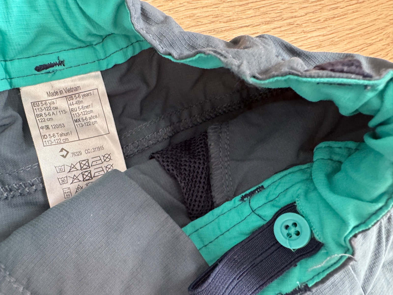 Predam detske turisticke odopinatelne nohavice. Su unisex, cize pre chlapca aj dievca pre vek 5-6 rokov (113-122 cm). Maju nastavitelny pas. Kupovane ako nove, nosene dcerkou. Su v 100% stave, bez poskodenie. Zipsy su funkcne.