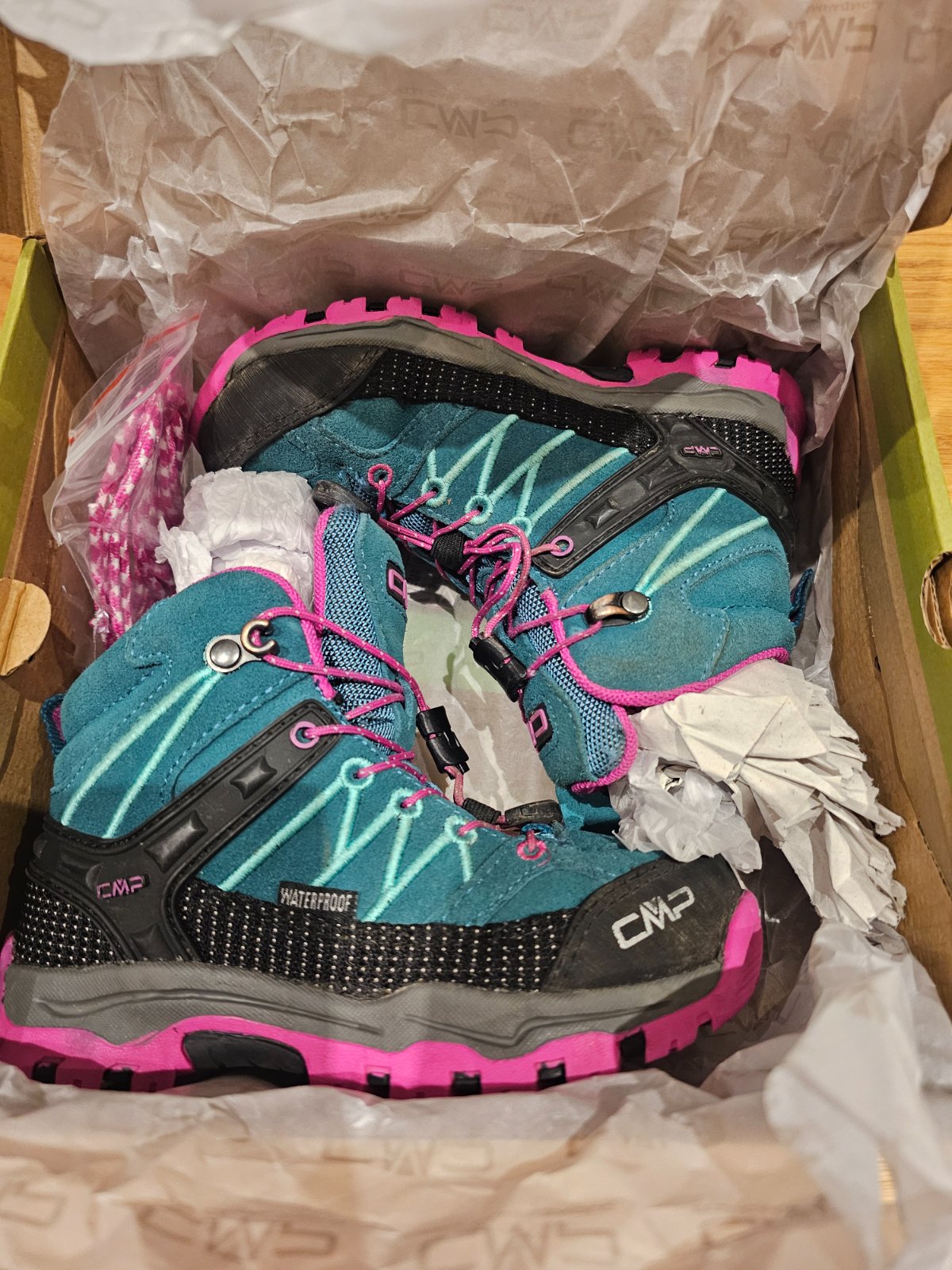 Detské turistické nepremokavé topánky vo vybornom stave aj s pôvodnou škatuľou a náhradnými šnúrkami. Veľkosť 28. Vhodné aj ako prechodná obuv (jar, jeseň).