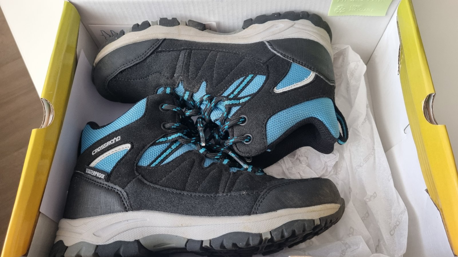 Predam turisticke topanky c.32, zn Crossroad, nosene par jrat mojou dcerou. Maju protosmykovu podrazku, nepremokava Wateeproof. Boli sme s nimi spokojne. Spice nie su okopane ani podrazka schodena, ziadne skrabance len na lavej strane sa spoj trochu povolil ( vid foto), ale pri chodzi to ani nevidno a ani nezatekalo do nich. Su lahke a super na turistiku ci aj bezne nosenie na prechadzky ci v dazdi.Vn.dl. 21,4 cm.