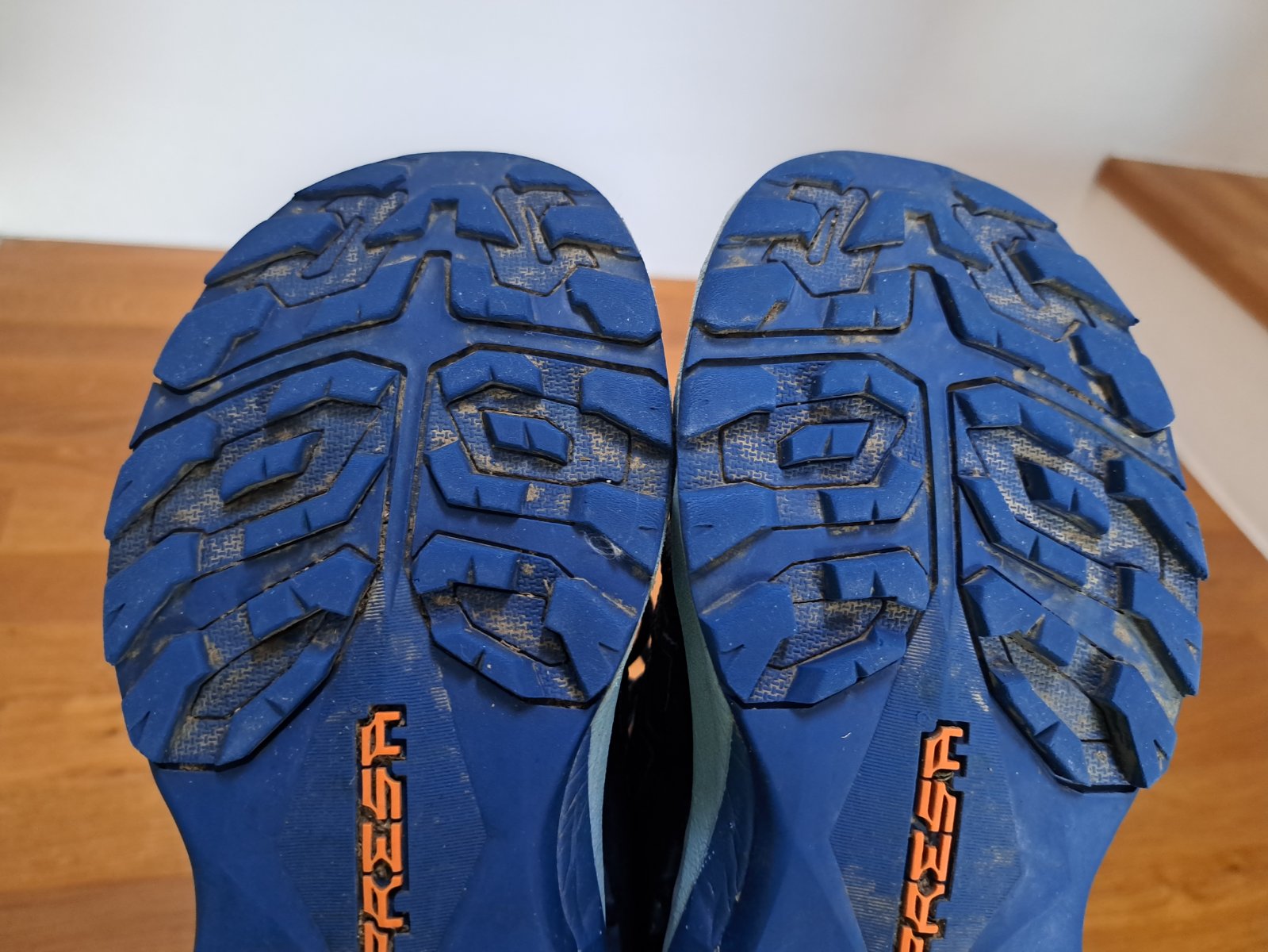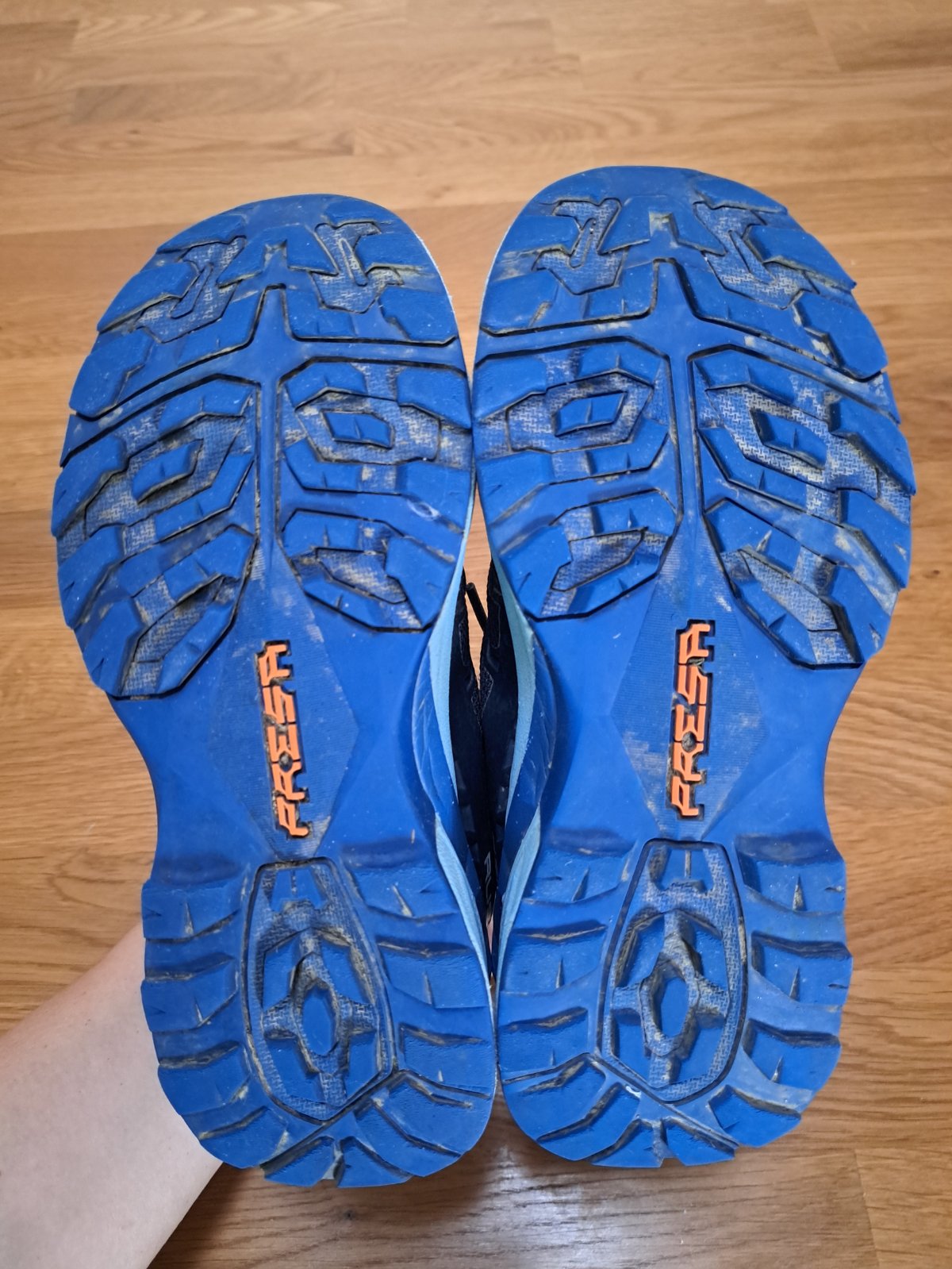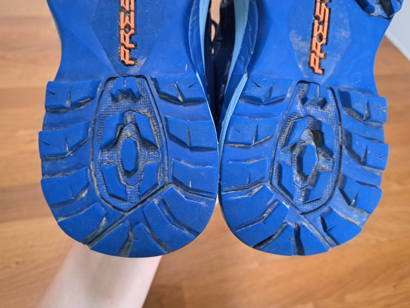 Vhodné na dorazenie - šnúrky v podstate nové, nosili sme iné. Podrážka ešte vo veľmi dobrom stave, nezchodená, v teréne dobre drží. Aj na nohe držia pevne, nie sú vyčaptané. Ale boli nosené často, takže majú rôzne poškodenia, šúchance a odreniny, vnútorná látka je miestami predretá.
