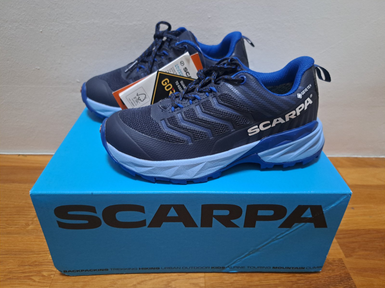 Prepracované detské topánky kvalitnej značky SCARPA, model Rush Kid GTX s odolným zvrškom a priľnavou podrážkou. Vhodné na turistiku a podobné outdoorové aktivity.