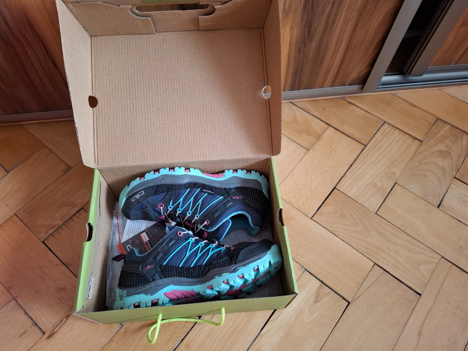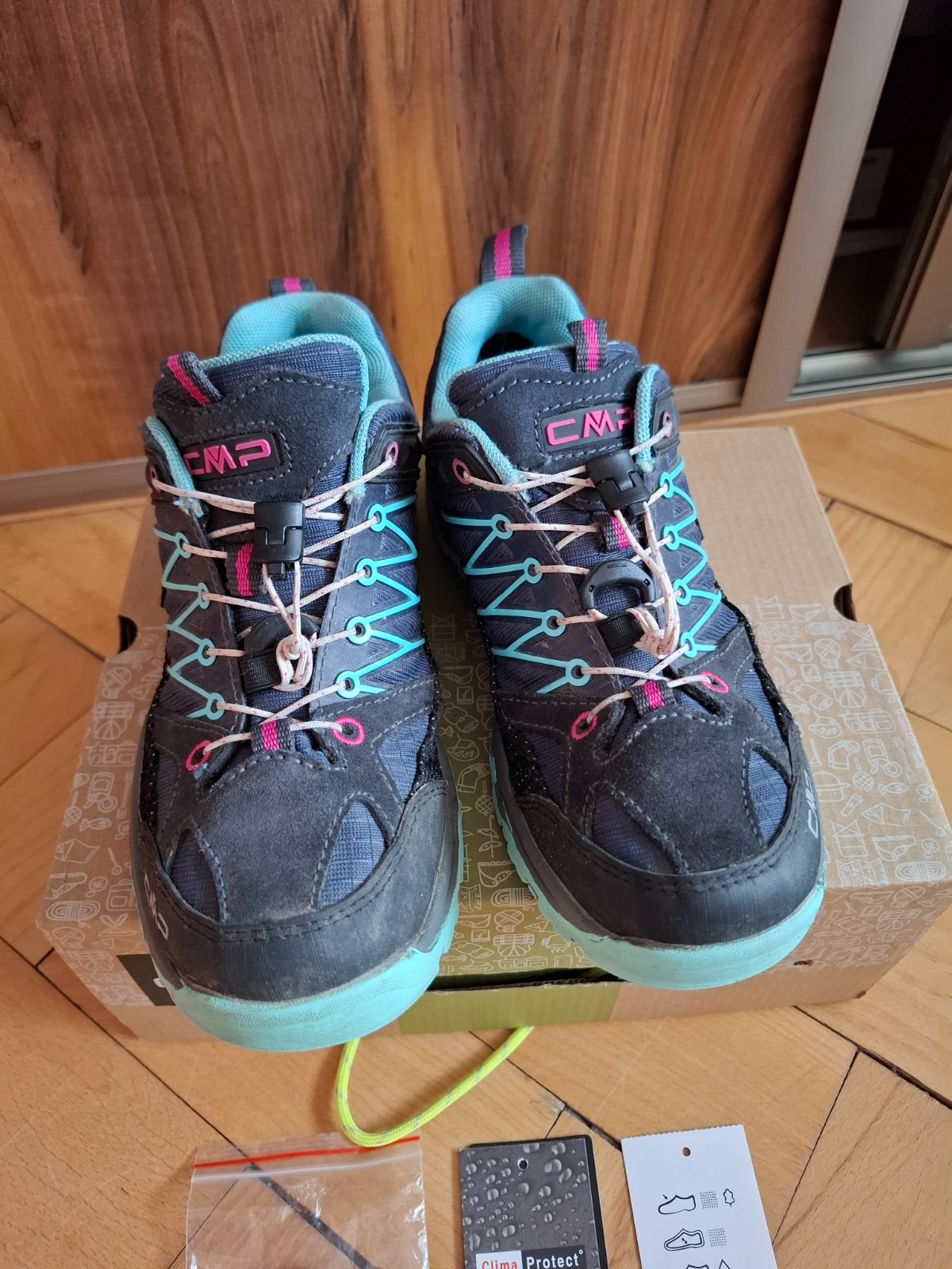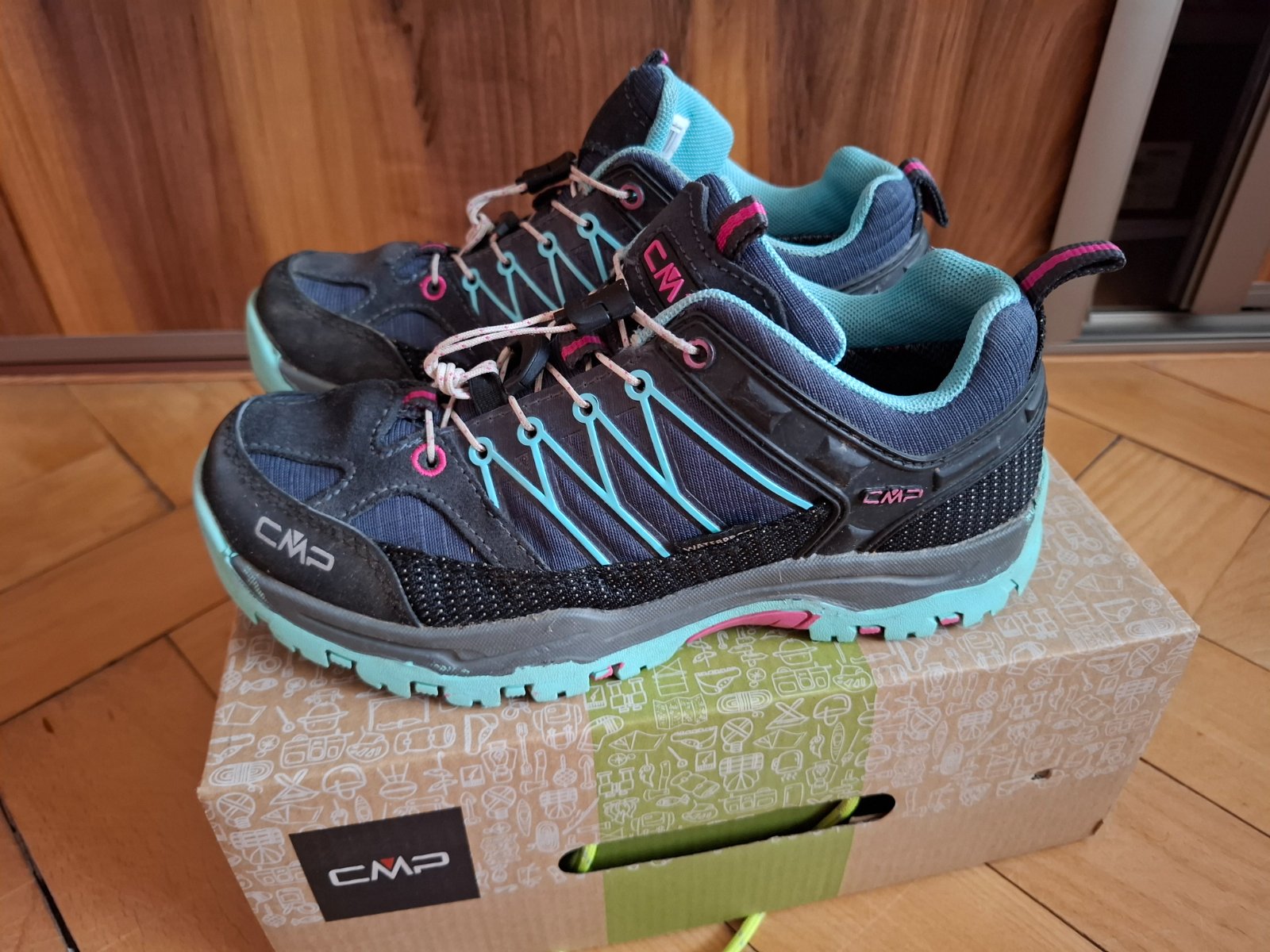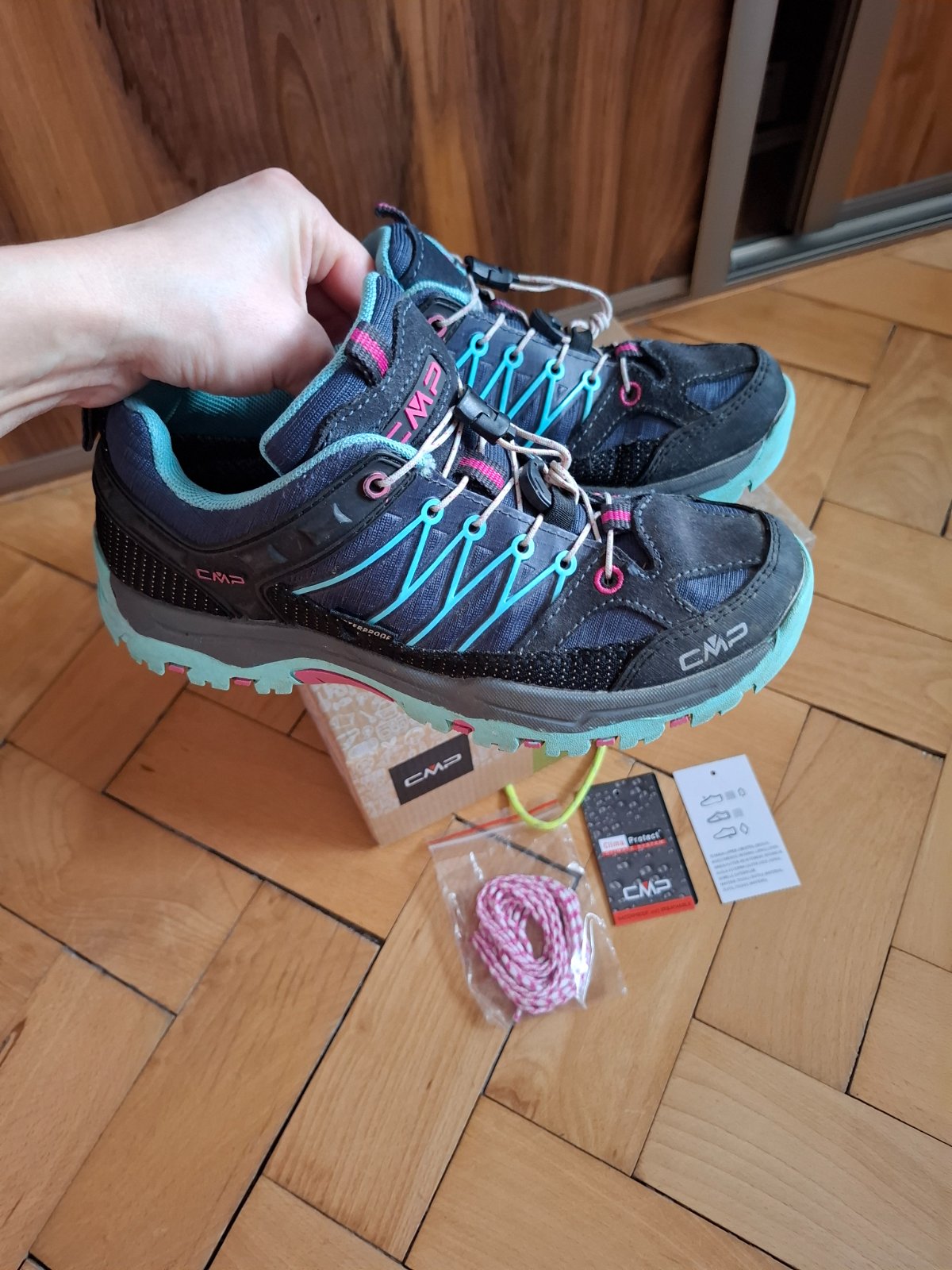 Predám skvelé turistické topánky po dcére. Značka Cmp, veľkosť detská 36 (vnútorná dĺžka vyberateľnej stielky 23cm). Vodeodpudivé, na rýchlošnurovanie ( dá sa zmeniť aj na klasické šnurovanie - šnúrky prikladám, nové, ešte nezmenené teda nepoužité).