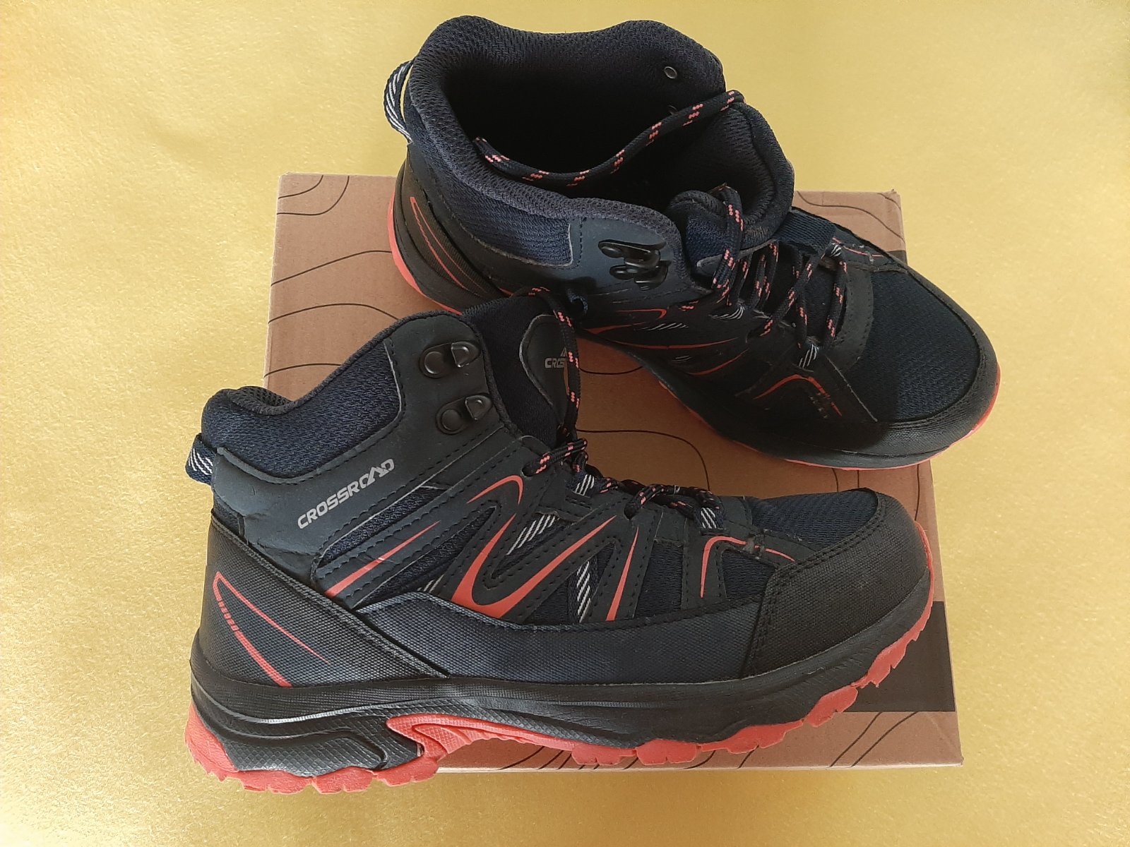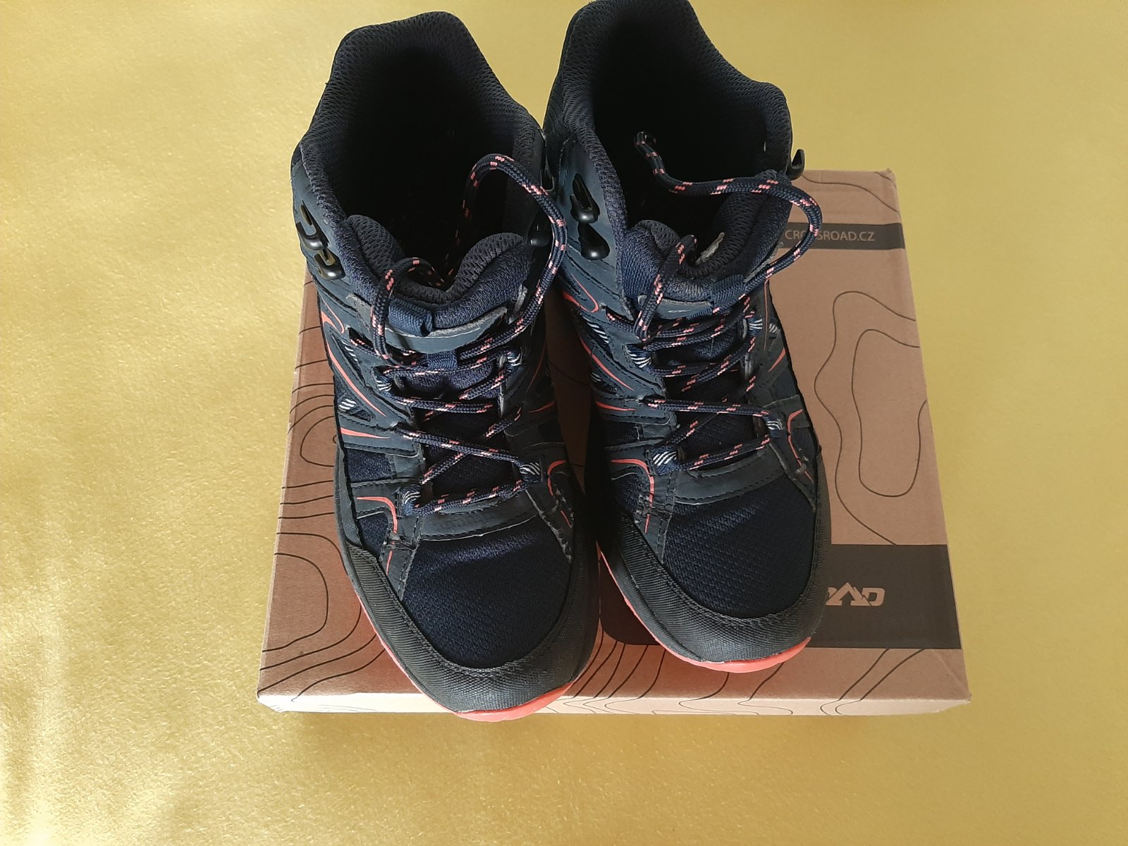 Členková softshelová obuv vhodná na turistiku pre dievčatá a dámy tmavomodrej farby v kombinácii s ružovou značky Crossboard vo veľkosti 37. VD 24,7cm. Obuv je na šnurovanie a nemá žiadne znamky poškodenia.