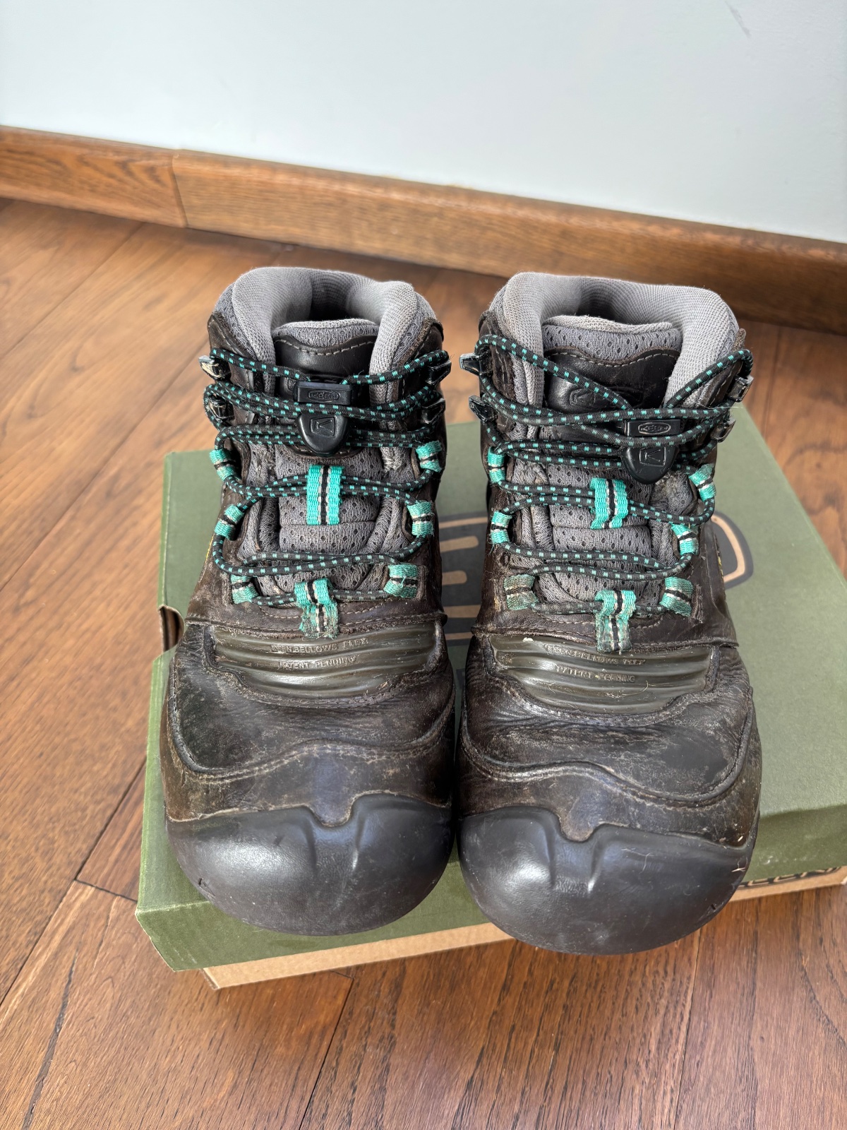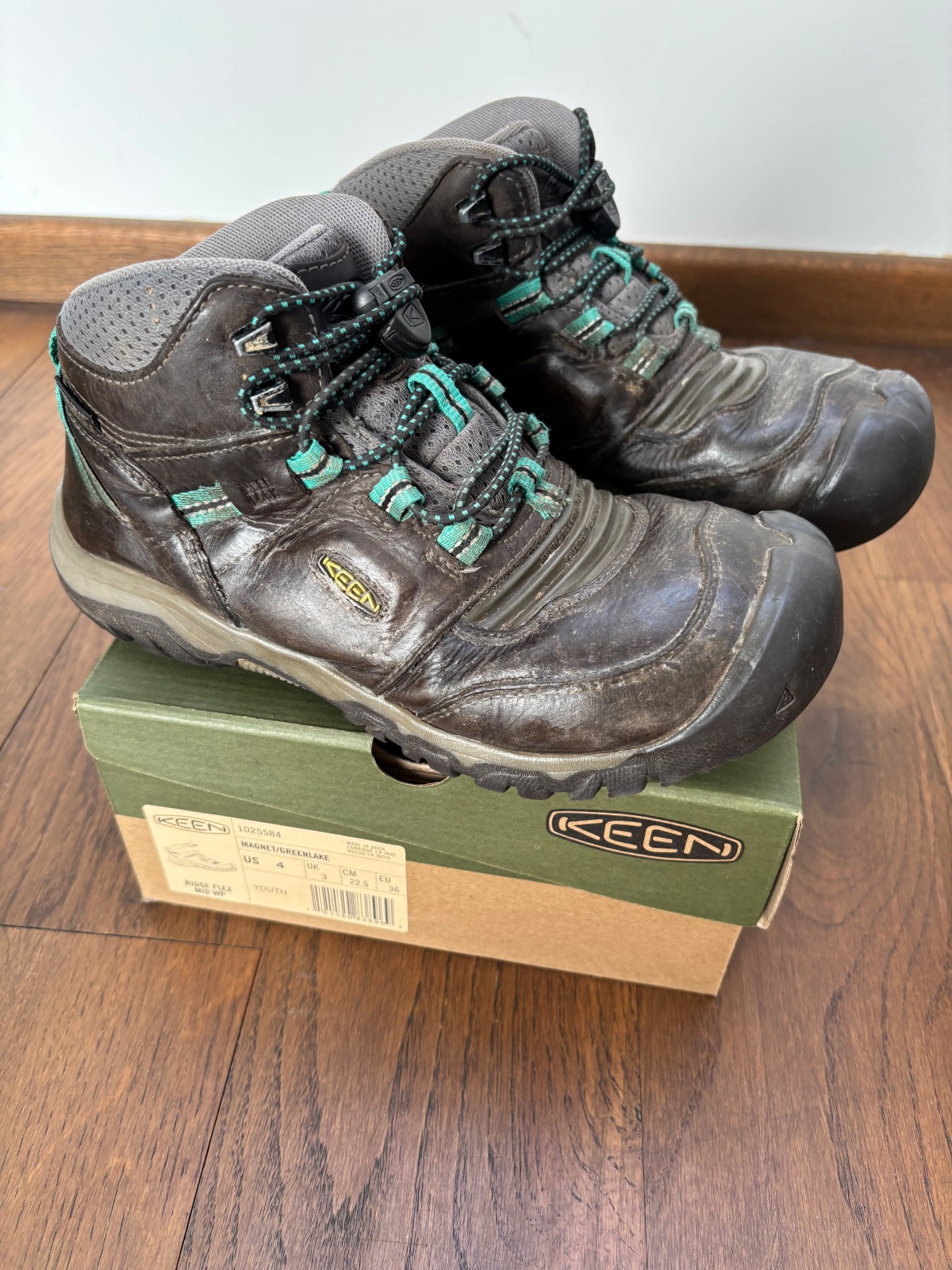 Nosené. Podrážka nie je schodená, na zvršku je obnosenie dosť viditeľné, ale je to koža, takže sa dá dobre navoskovať a zostávajú nepremokavé. Nad prstami majú gumenú časť, takže sú veľmi ohybné a flexibilné. Stále ešte poslúžia na výlety, do prírody, školy v prírode atď. od jari do jesene, príp. zimy bez snehu (sú poločlenkové). Pridám aj tenisky Keen na poslednej foto tiež veľ 36.