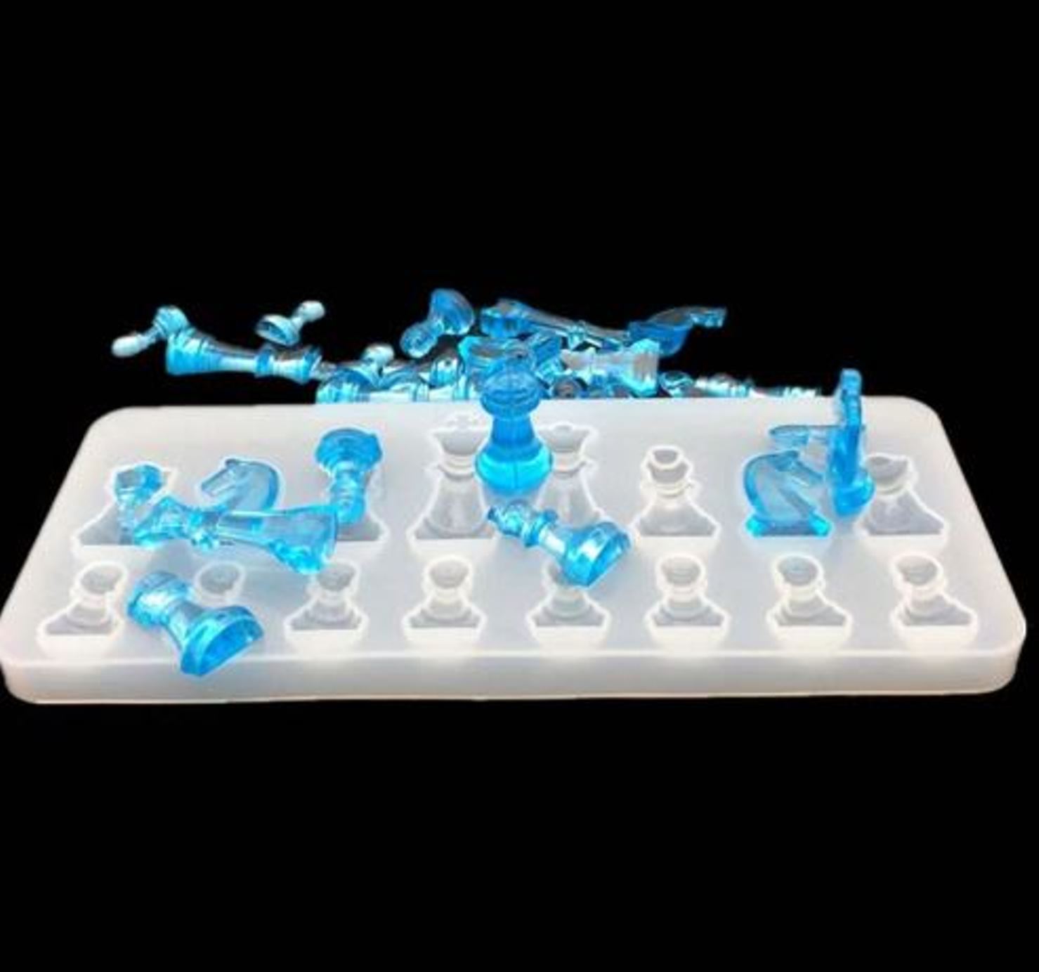 Silikónová forma v šachovnice, obsahuje 16 kusov šachových figúriek, veľkosť formy 17cm x 11cm x 5cm.