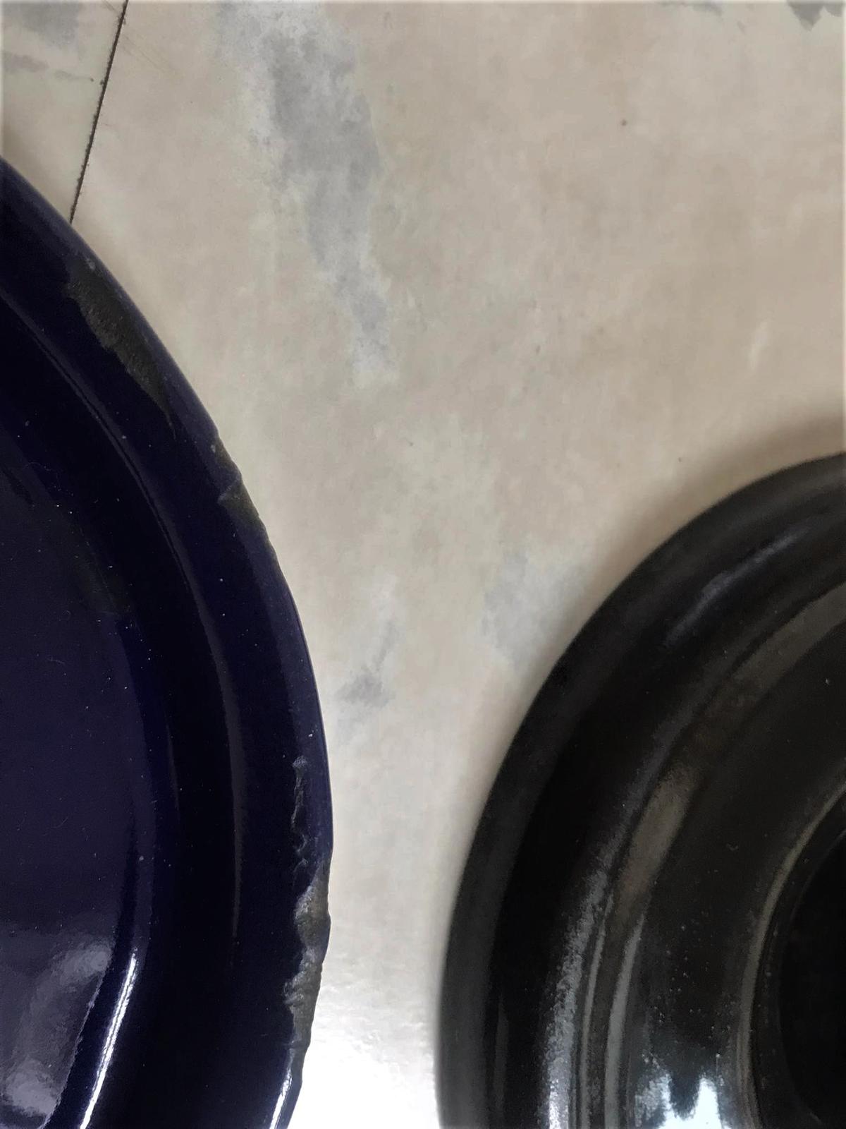 smaltované staré prikrývky,modrá na boku olúpnutá,ostatné bez poškodenia,modrá - vnút. priemer = 13 cm,čierna = 13,5 cm,hnedá rovná = 15,5 cm,hnedá plastická =17 cm