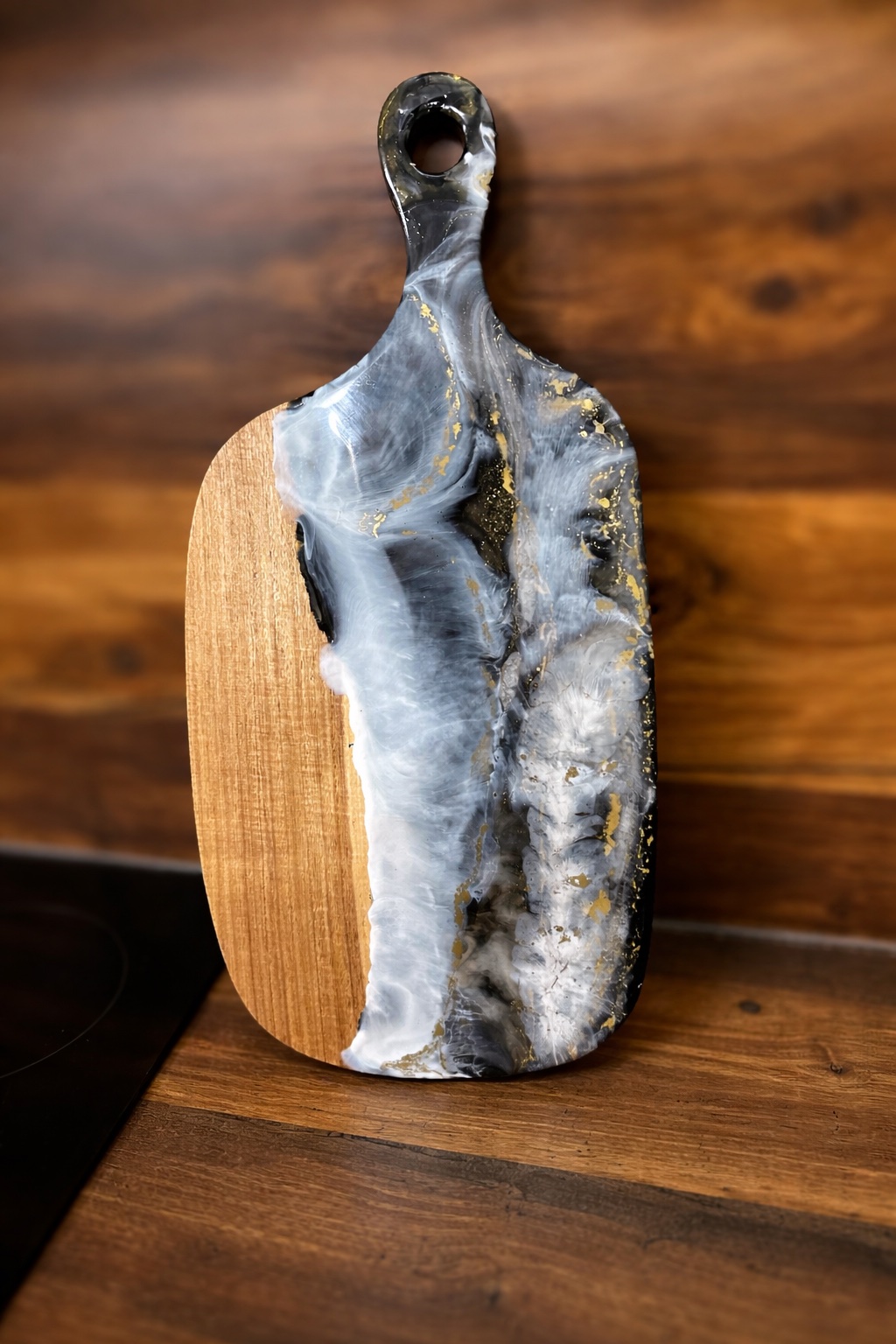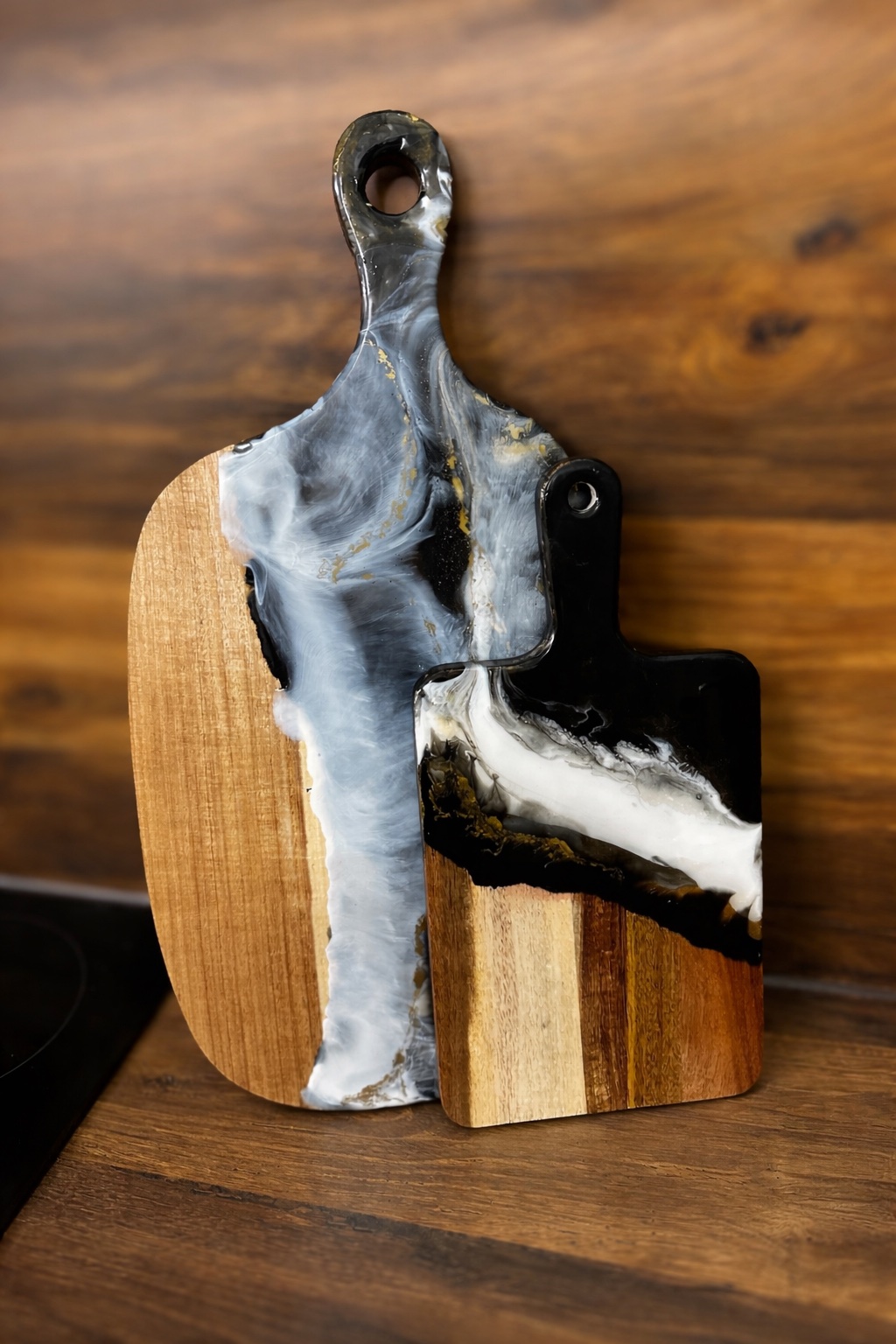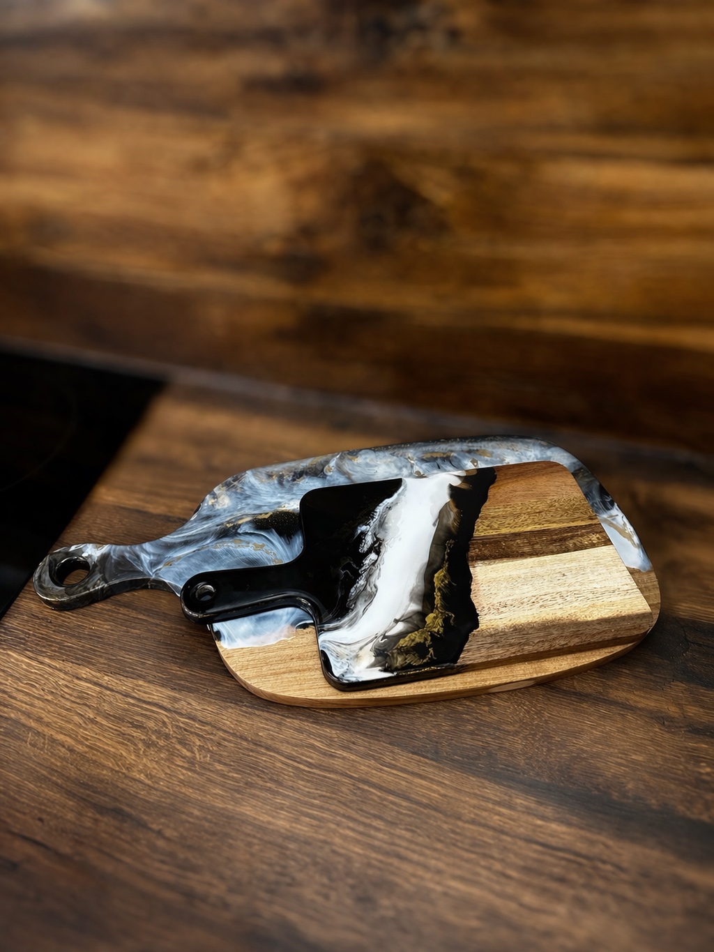 Drevené dosky , skrášlené z jednej strany epoxidovou živicou.Originálny doplnok do kuchyne ,vhodné aj ako darček .Z jednej strany krájam z druhej servírujem.Ručna práca ,použitá živica je vhodná na styk s potravinami.Nevhodné do myčky.Veľka doska 30€,malá 25€