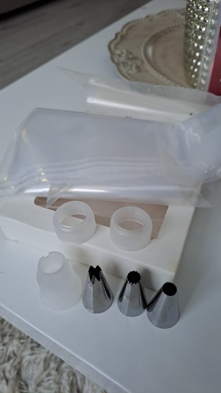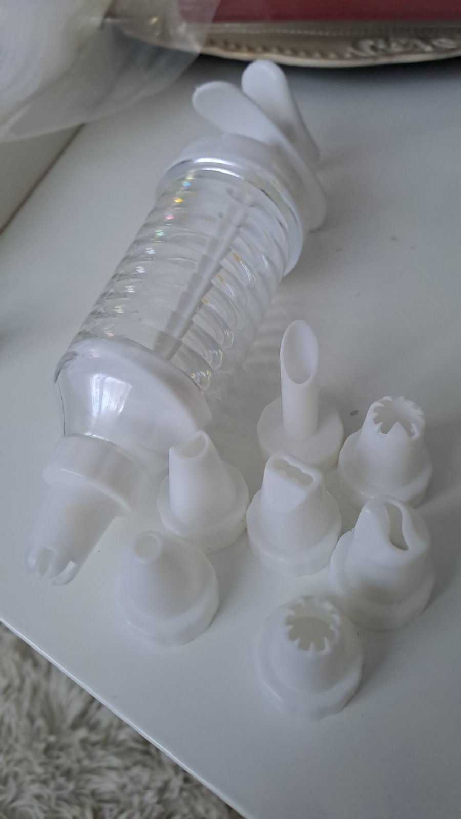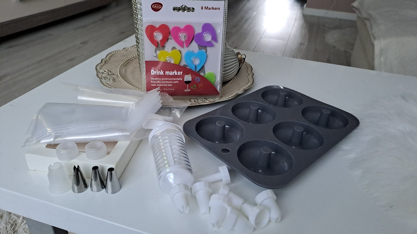 Kuchynské pomôcky. Silikonová forma na donuty. Zdobiace vrecko a forma. "Značenie" na poháre. Cena spolu.