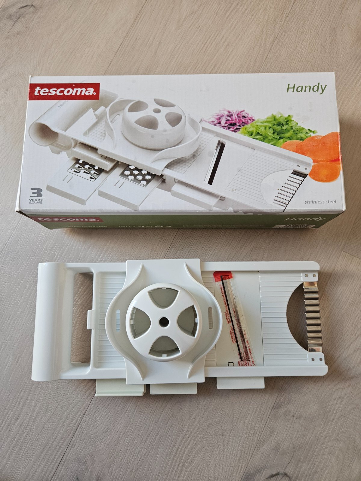 Tescoma Handy multifunkčné strúhadlo. Pár krát použité. Ako vidieť ešte má ochrannú pásku na čepeli noža.