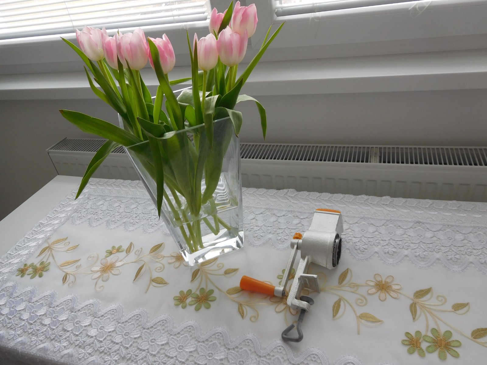 Nový krájač na hranolky zn.Tescoma, má 2 nadstavce na krájanie veľkosti hranoliek.