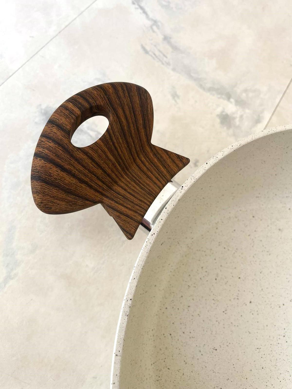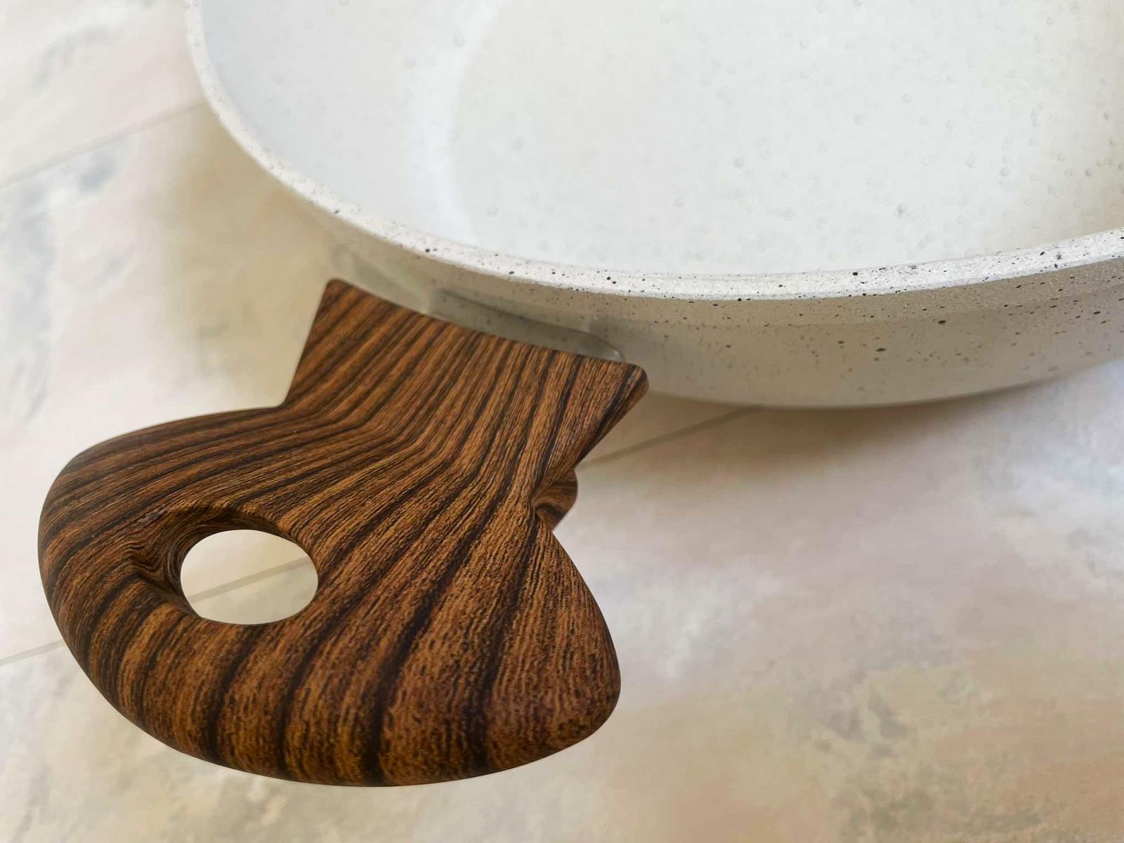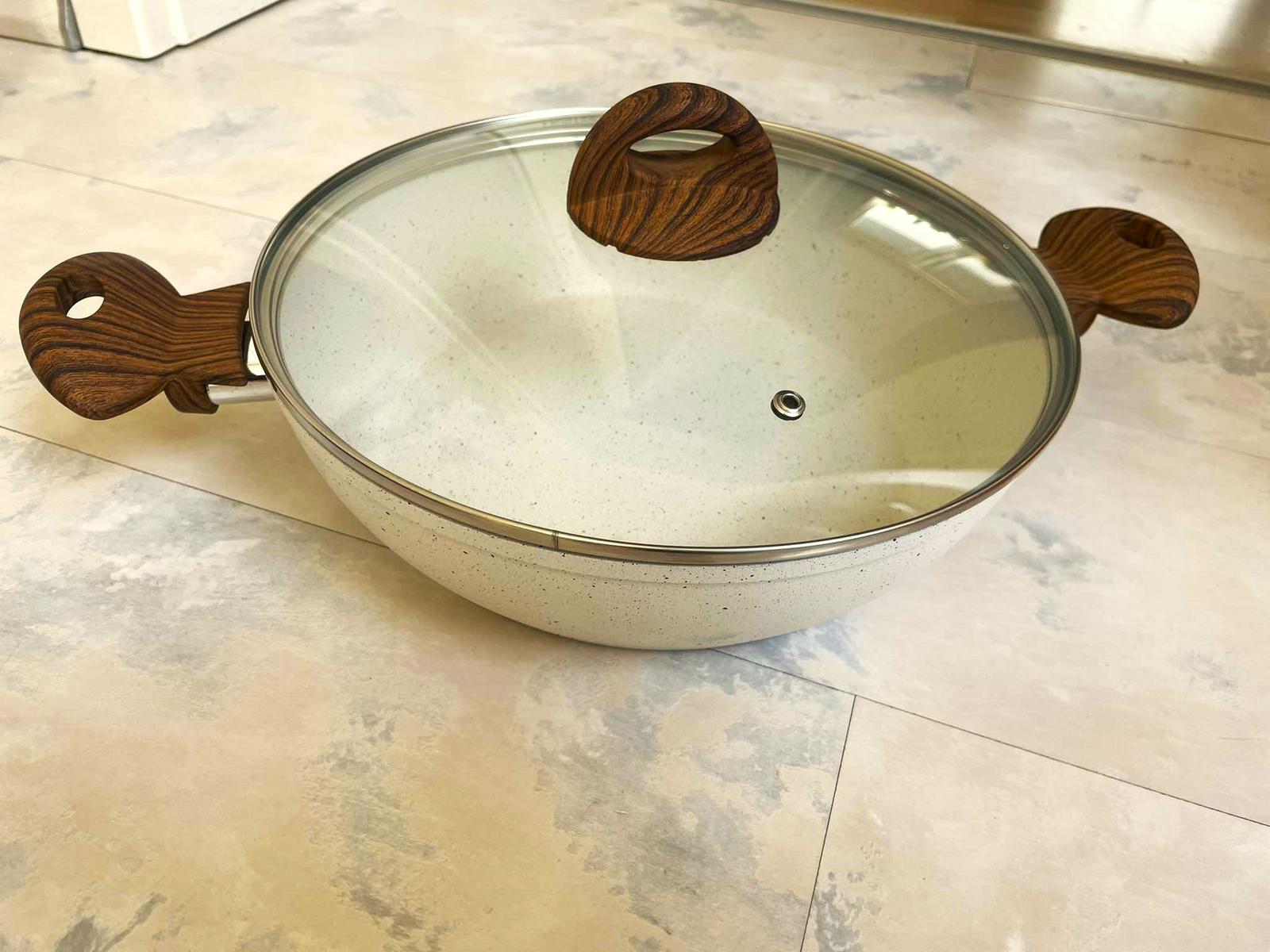 Luxusná kuchynská panvica s pokrievkou,ako nová,bola raz použitá na ohrev vody,vhodná na sporák i na indukciu,s antiadhéznym povlakom s charakterom nelešteného prírodného kameňa. Smažiť i zapekať môžete aj s použitím minimálneho množstva tuku. Povlak je vysoko odolný,vďaka antiadheznému povlaku zvonka nádoby sa ľahko čistí a atraktívny vzhľad si zachováva dlhodobo. Rukoväte sú nevodivé plastové s dizajnom dreva, super darček, priemer = 28 cm, výška rajnice = 9 cm,farba biela fŕkaná - ako kamenina