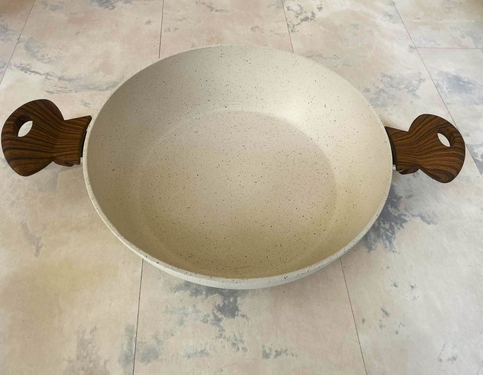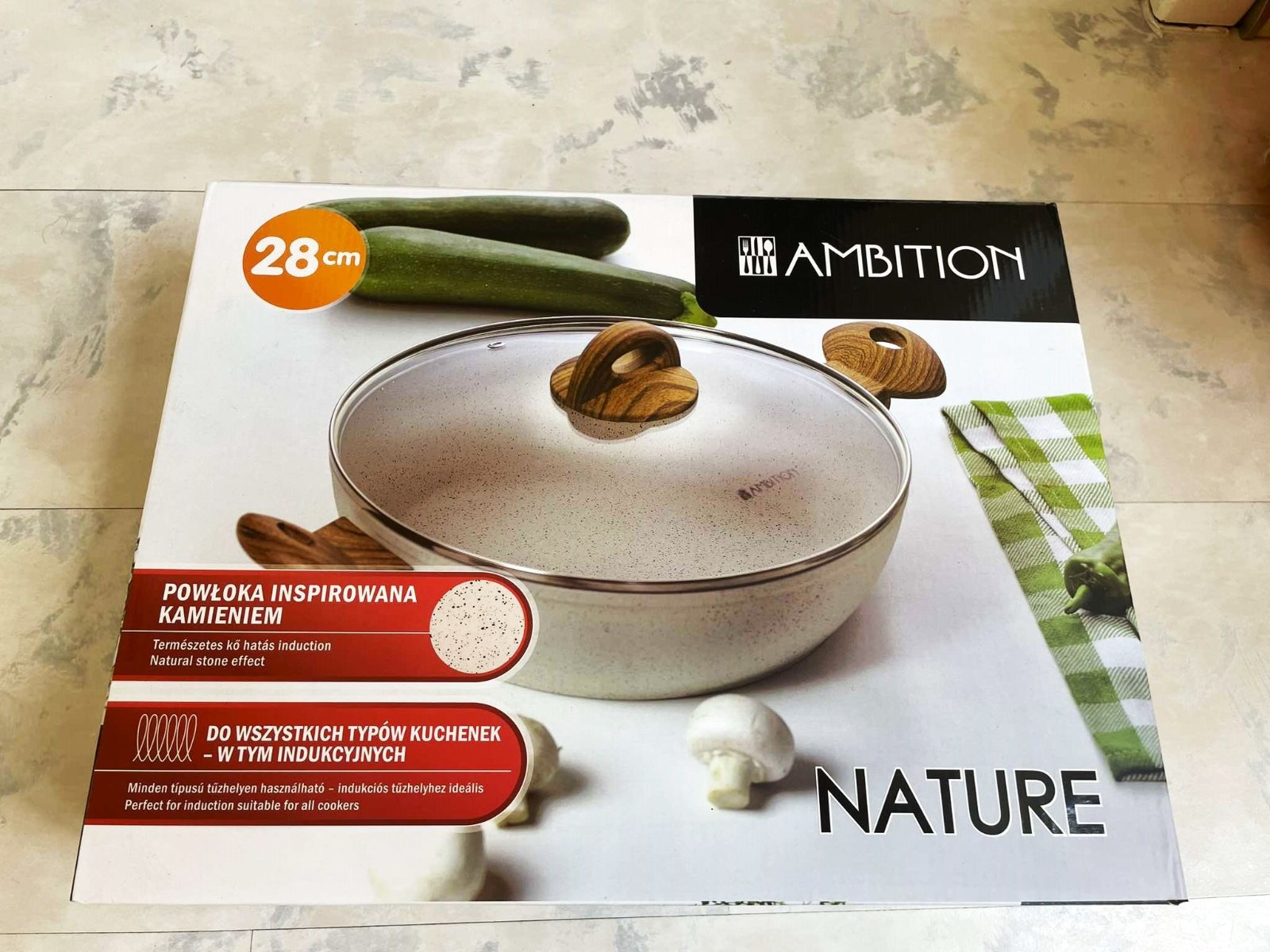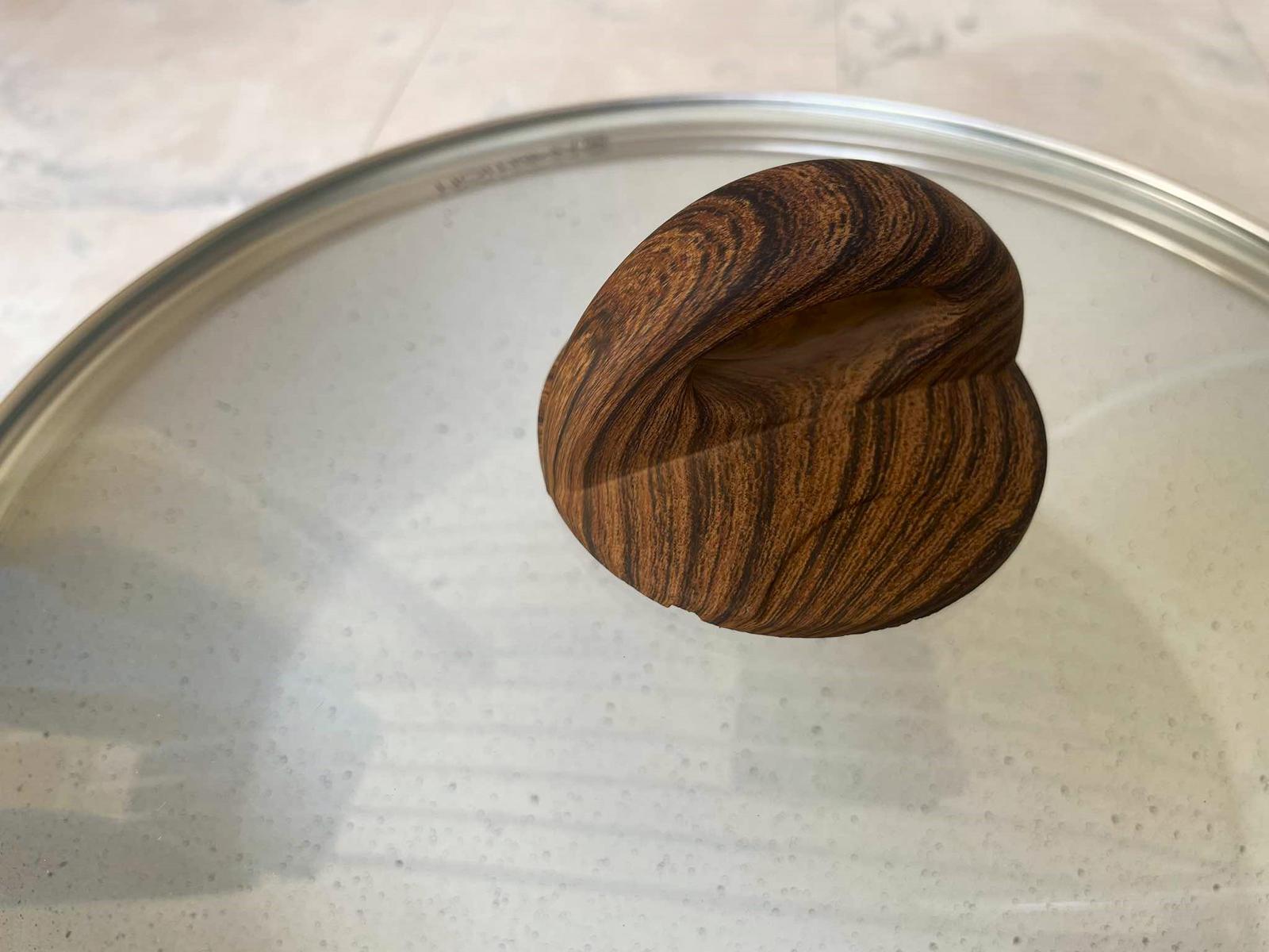 Luxusná kuchynská panvica s pokrievkou,ako nová,bola raz použitá na ohrev vody,vhodná na sporák i na indukciu,s antiadhéznym povlakom s charakterom nelešteného prírodného kameňa. Smažiť i zapekať môžete aj s použitím minimálneho množstva tuku. Povlak je vysoko odolný,vďaka antiadheznému povlaku zvonka nádoby sa ľahko čistí a atraktívny vzhľad si zachováva dlhodobo. Rukoväte sú nevodivé plastové s dizajnom dreva, super darček, priemer = 28 cm, výška rajnice = 9 cm,farba biela fŕkaná - ako kamenina