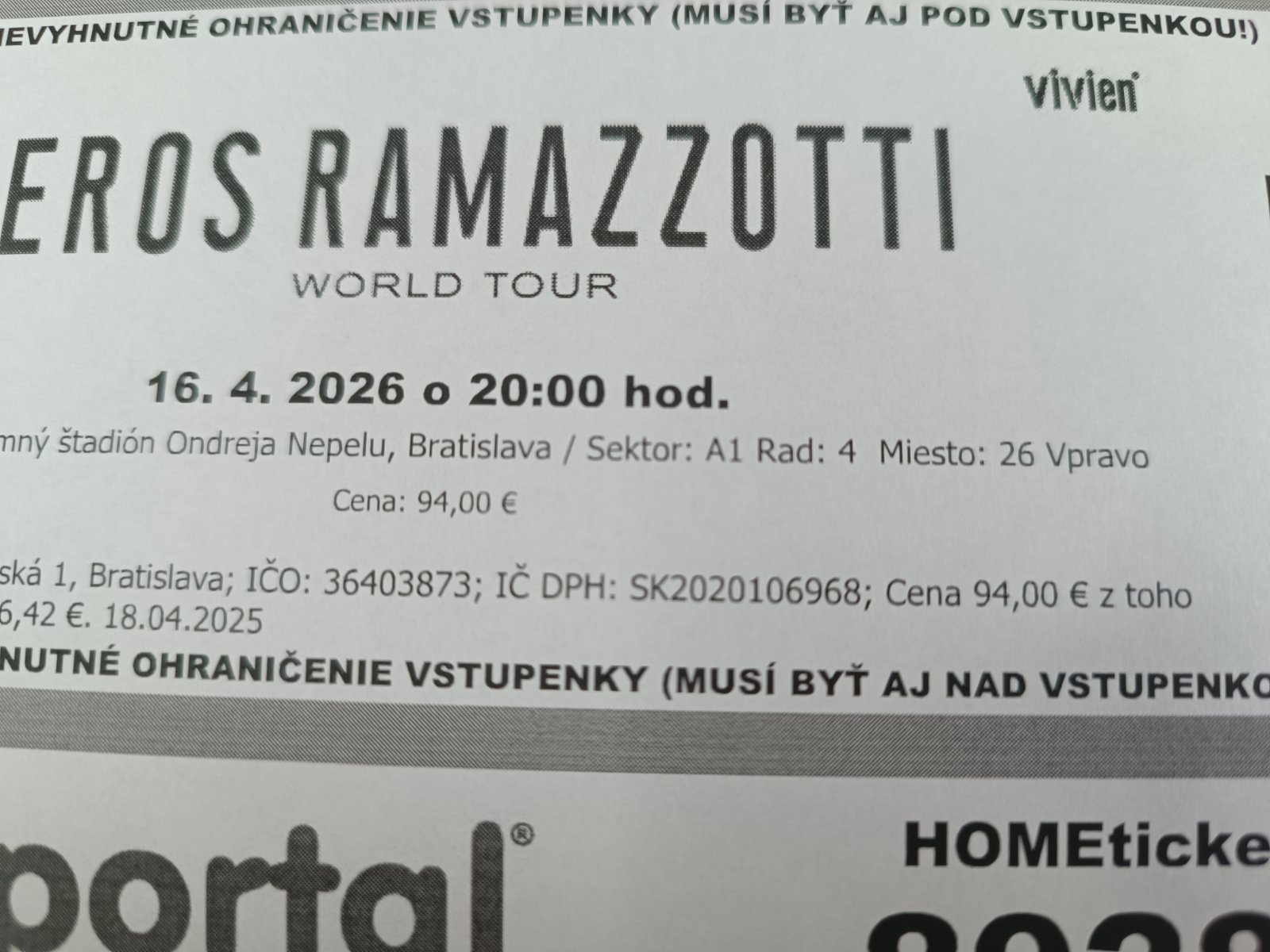 Predám 2 vstupenky na koncert Eros Ramazzotti 16.aprila 2026 v Bratislave. Pôvodne 94,-/ks, predám 2 vstupenky za 168,-. Bližšie informácie správa.