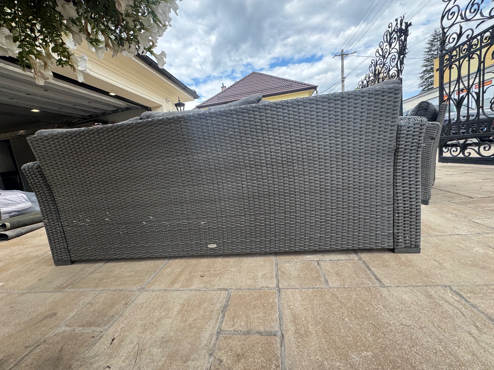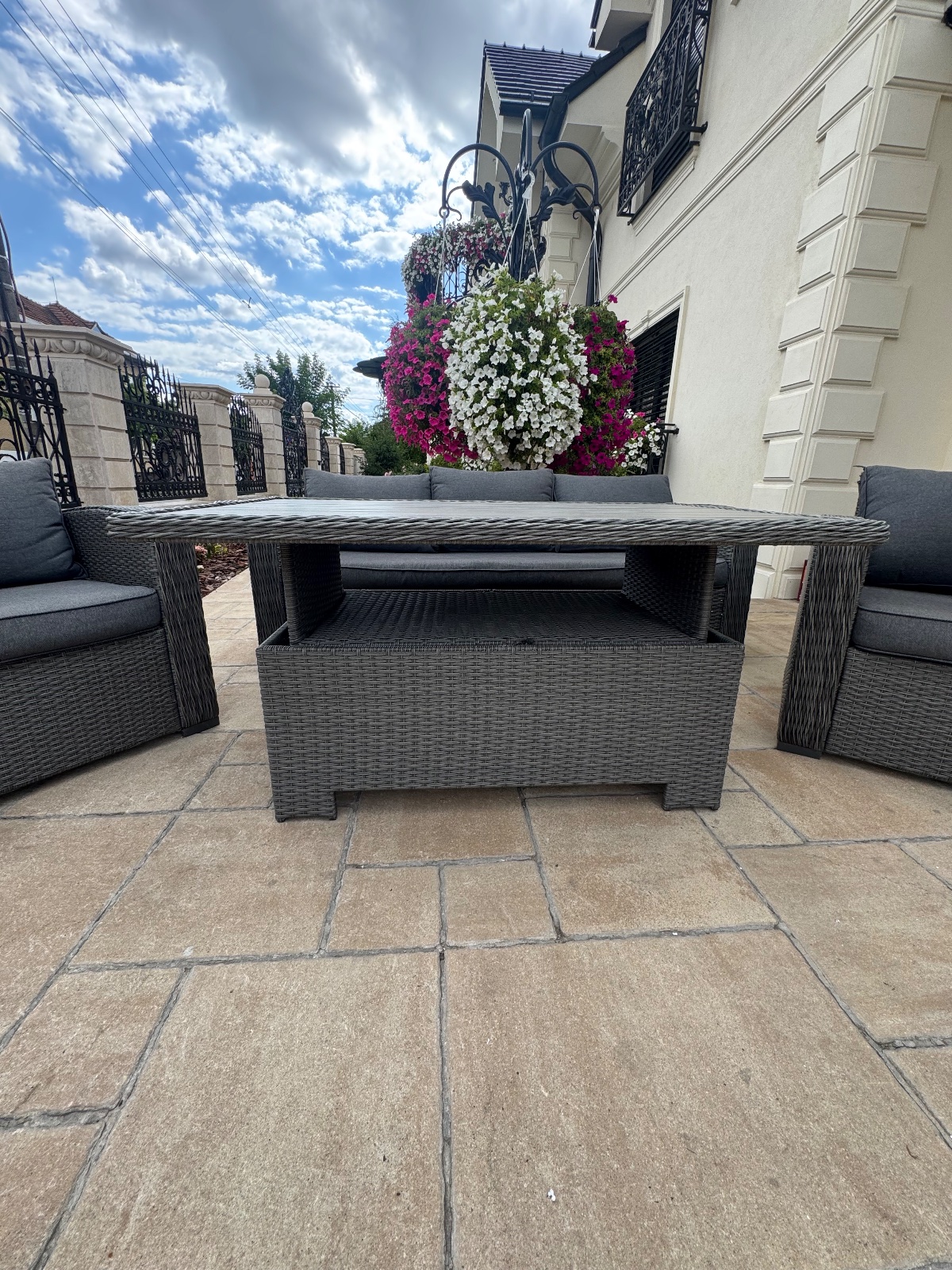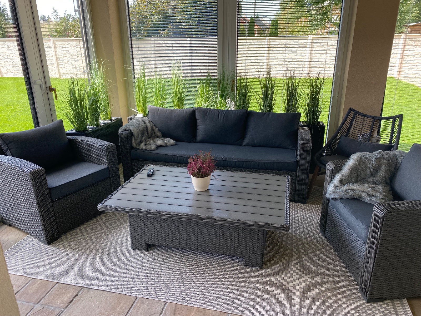 V top stave, bol používaný len 2 roky na krytej terase. Stôl je polohovateľný. Kvalitné hrubé podušky, masívne kreslá.