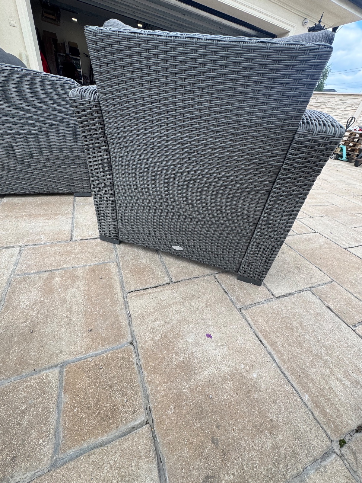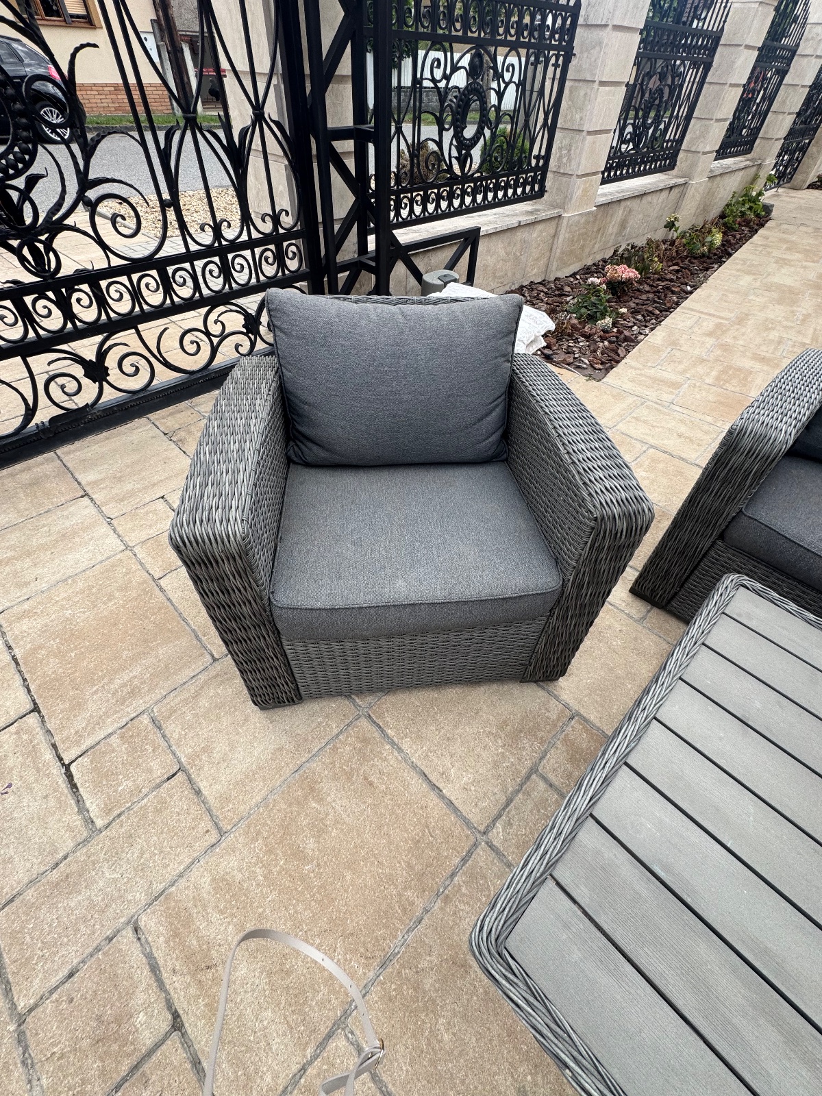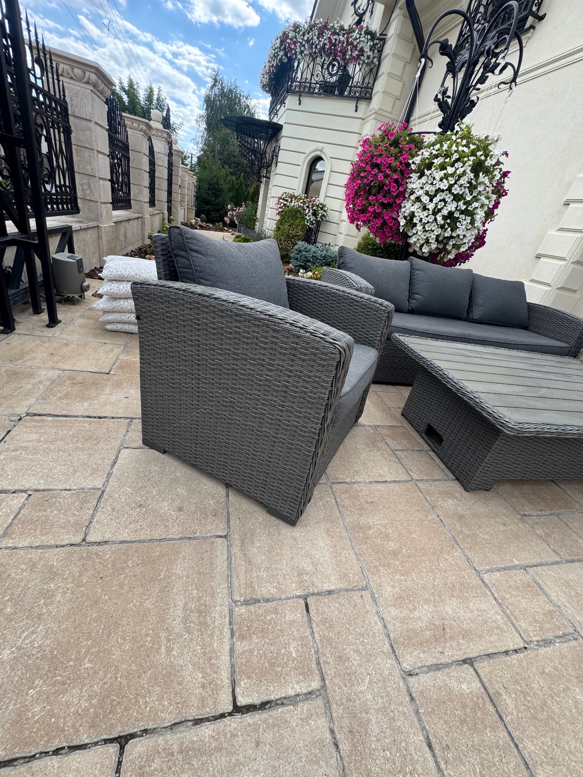 V top stave, bol používaný len 2 roky na krytej terase. Stôl je polohovateľný. Kvalitné hrubé podušky, masívne kreslá.