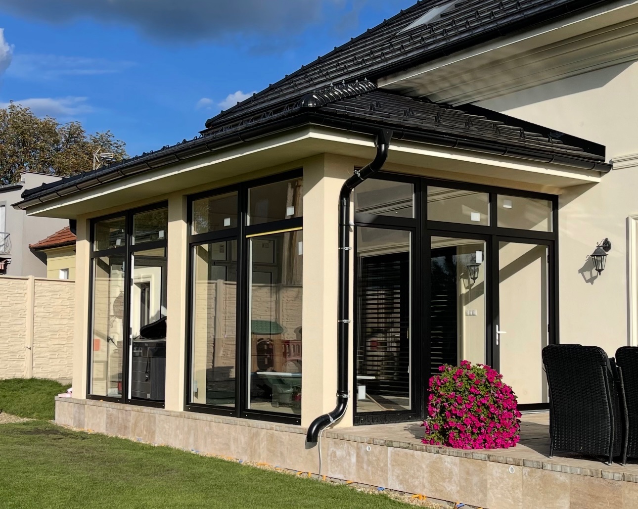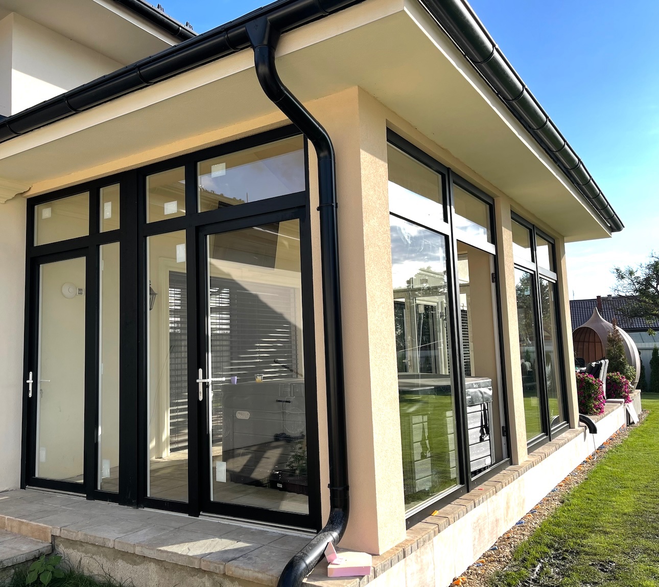 Je to hliníko-plast, izolované dvojsklo, vonkajšia farba čierny hlinik, vnútorná farba biely plast. Na každom okne sú interierové žalúzie čierne. Dvere sa dajú zamknúť na kľúč. Len 2 velké skla vľavo vpredu sú fixné, ostatné sa všetky dajú otvoríť alebo vyklopiť, Ako nové!
