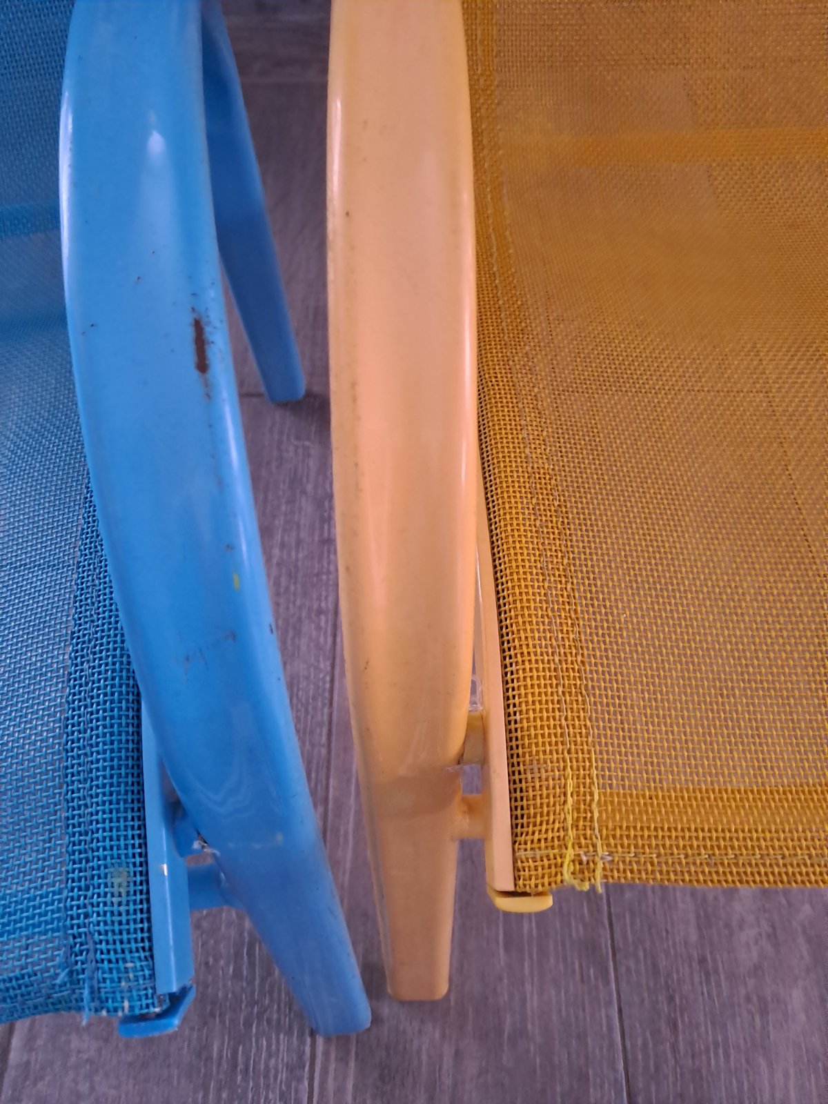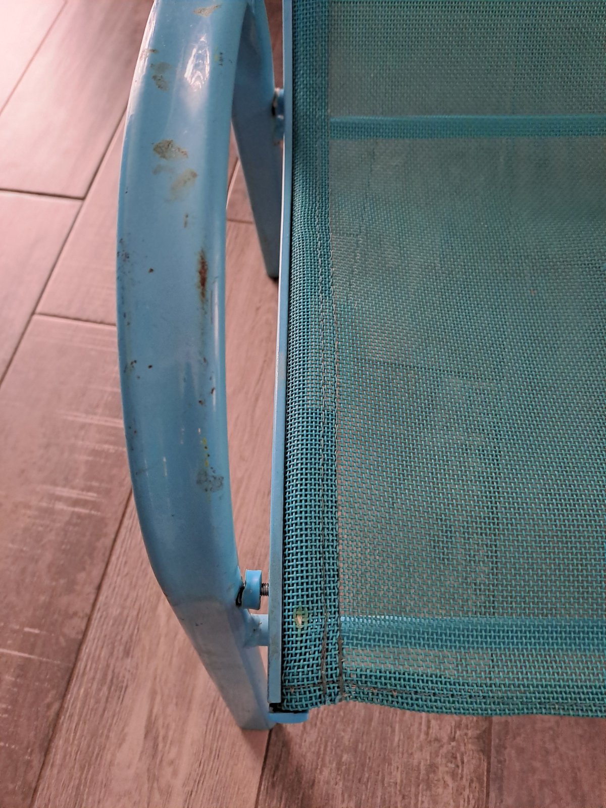 Super stav, len malé škrabance,vid foto, bežné používanie vonku. Pevné sedenie,kov. Kvalitné. Deti ich mali veľmi radi,už su veľké posúvam za nižšie. V ponuke modra aj žltá.