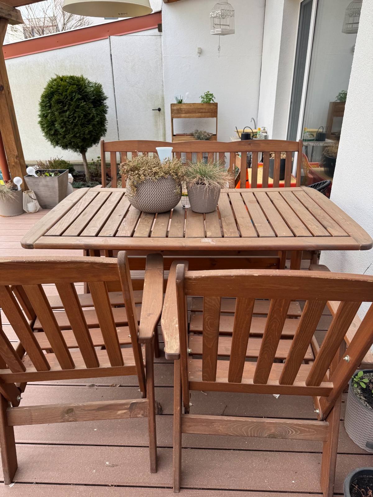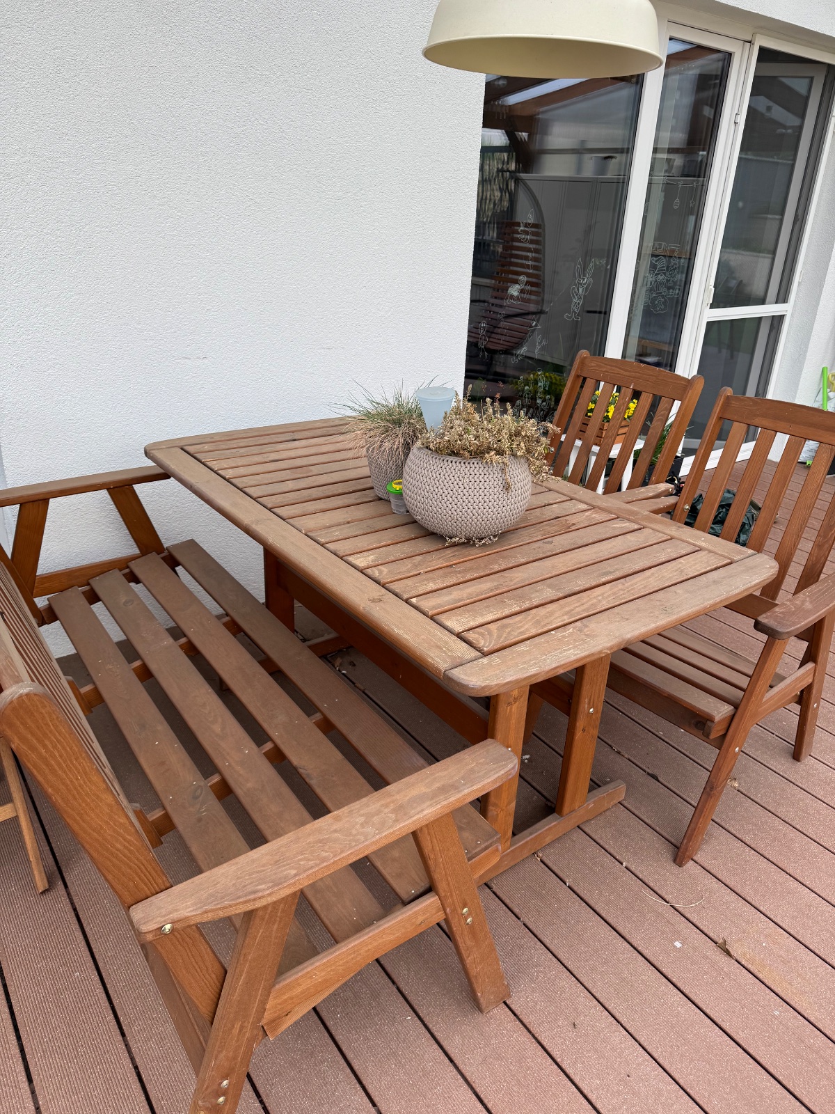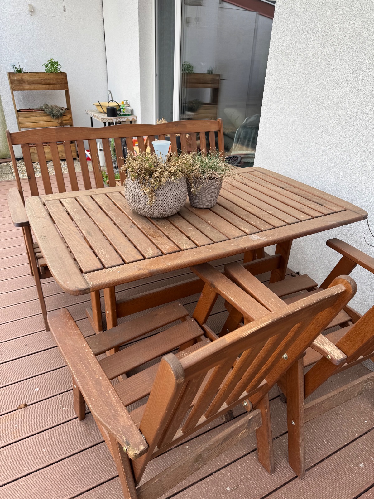 Predám drevený záhradný nabytok stôl, lavica stoličky polohovateľné.. bez poškodenia dreva, potrebné len premorit alebo prelakovat, vhodne na terasu alebo chatu