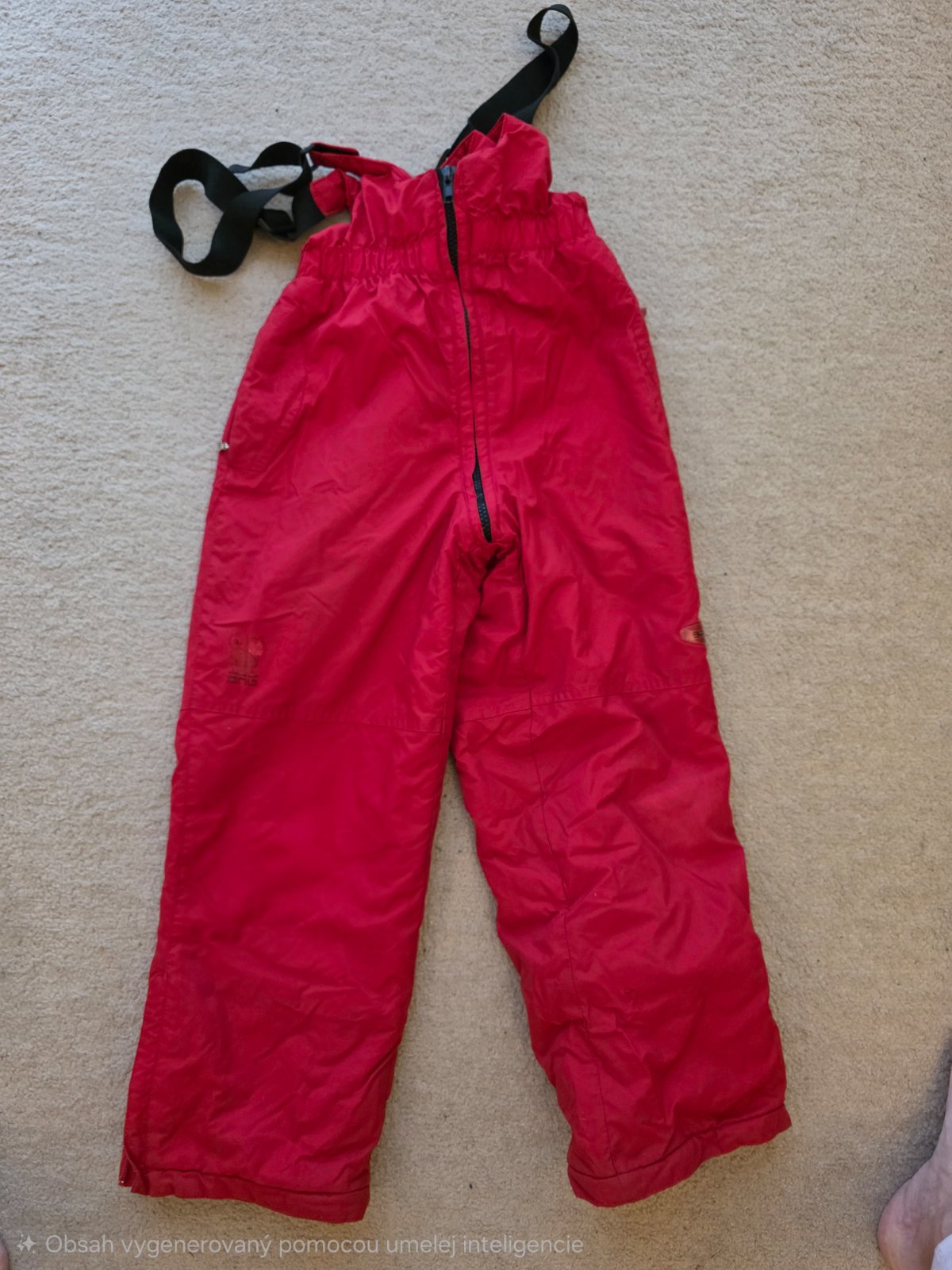 Výhody:Odolný nylonový materiál, podšívka a výplň z polyesteru – udrží teplo aj v mraze. Kvalitná talianska značka BRUGI. Vrecká na suchý zips, praktické nastaviteľné traky, snežné manžety vo vnútri nohavíc, zipsy na spodku nohavíc na ľahké navlečenie cez lyžiarky , farba výrazná červená, deti sú dobre viditeľné.