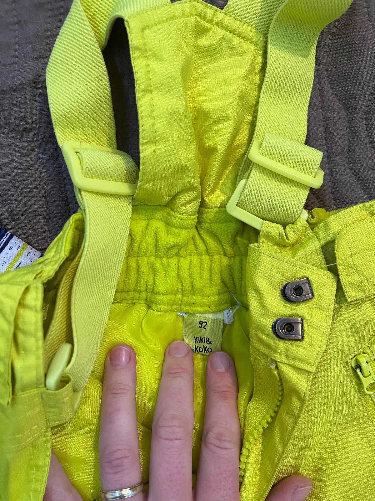 Oteplovačky použité len týždeň na lyžiarskom výcviku, mierne vidieť medzi nohami znečistenie od lyžiarskej pomy.