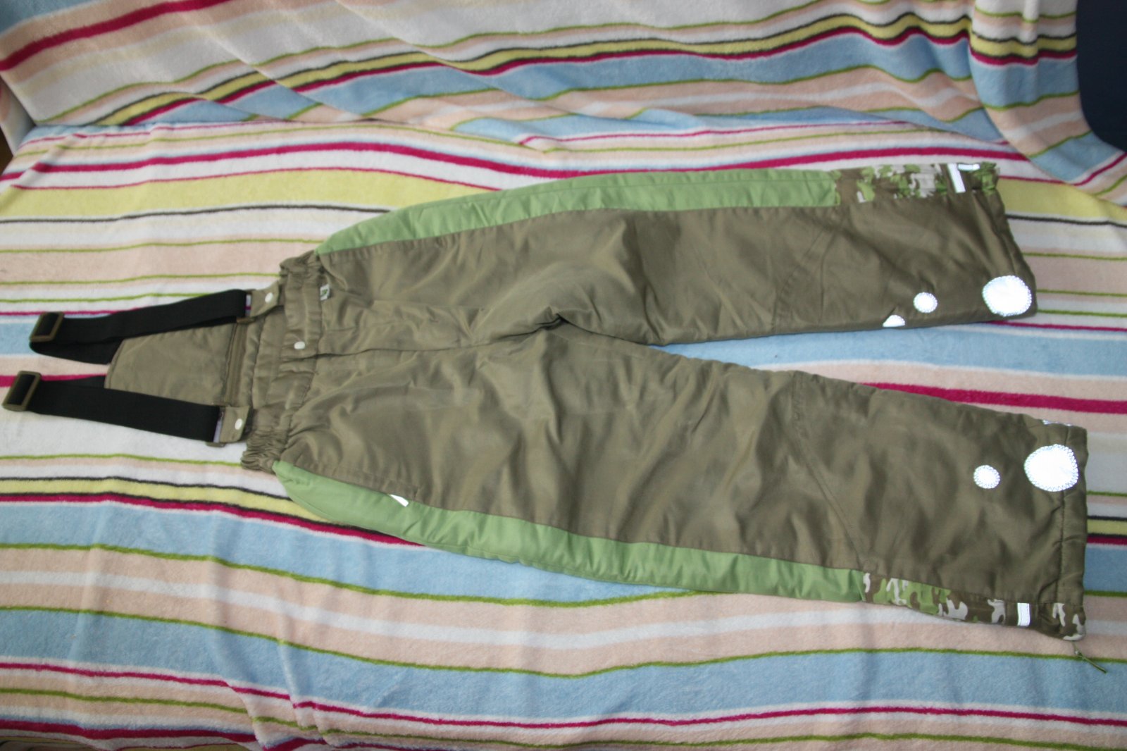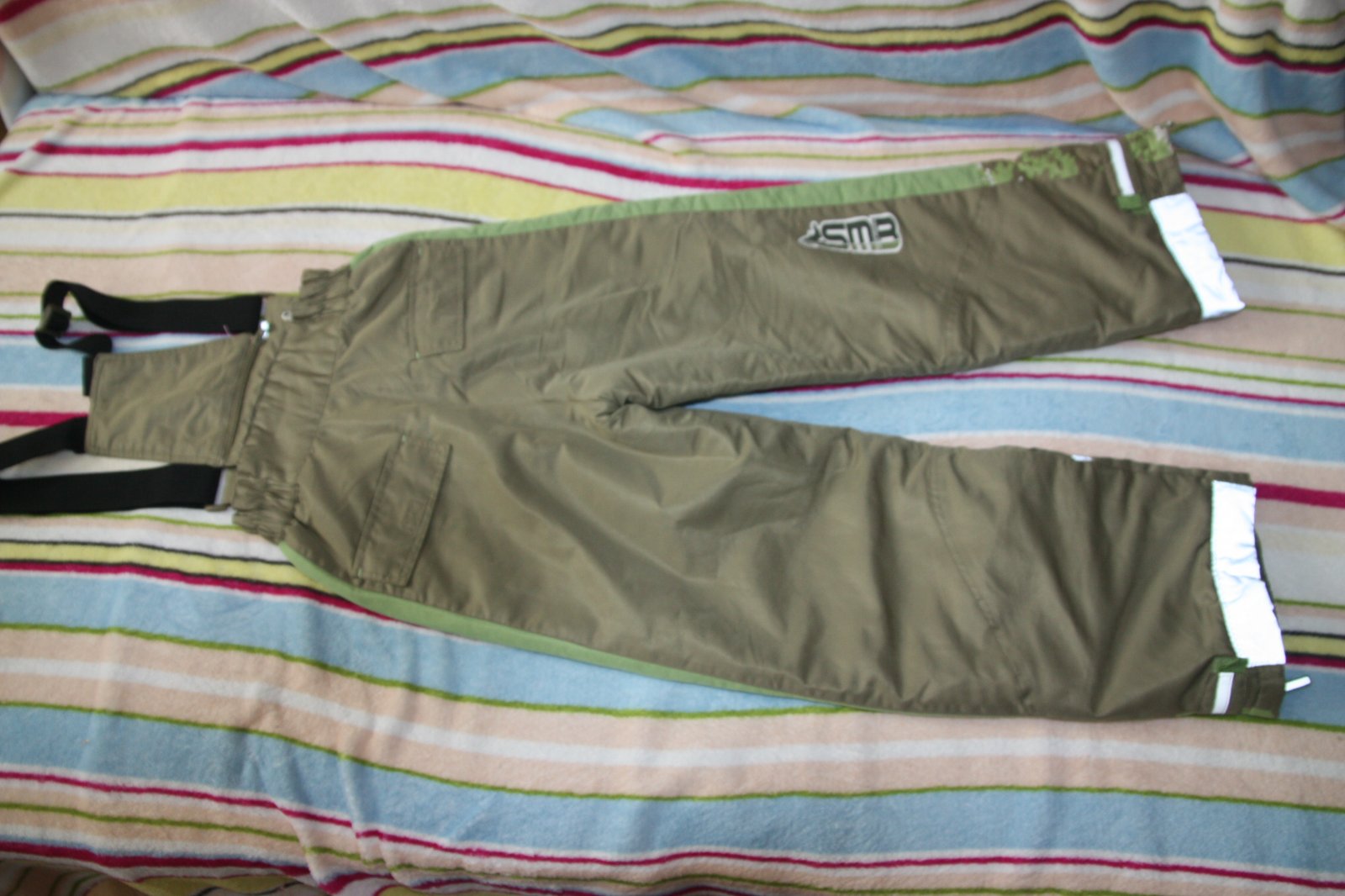 Nosene, na nohach trochu od lyzi dosekane - je to poprekryvane nasivkami, ostalo tam len par viditelnych skrabancov. S trakmi od ramena po spodok max 134 cm. Gate vonkajsia dlzka 88 cm, vnutorna dlzka 58 cm. Pas max 2x 38 cm.