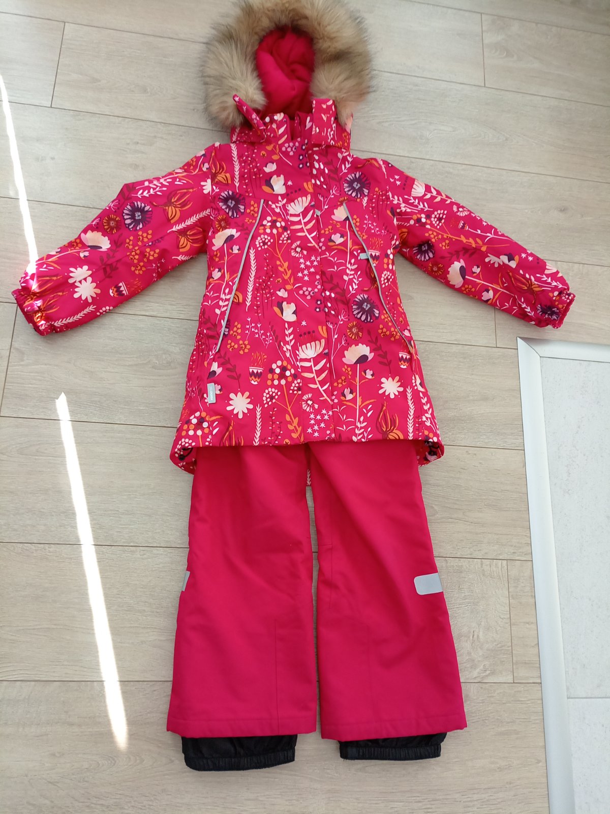 Predám komplet Reima v. 128. Vetrovka bola párkrát oblečená. Je vo výbornom stave. Žiadne poškodenia som nenašla ani viditeľné známky nosenia. Oteplovačky boli nosené viac. Nosenie trošku vidno na kolienkach (viditeľné len pri dôkladnom prezeraní) a na tej čiernej vnútornej protisnehovej zabrane je dierka (je to nafotené). V prípade záujmu odmeriam, popr. pošlem viac foto.