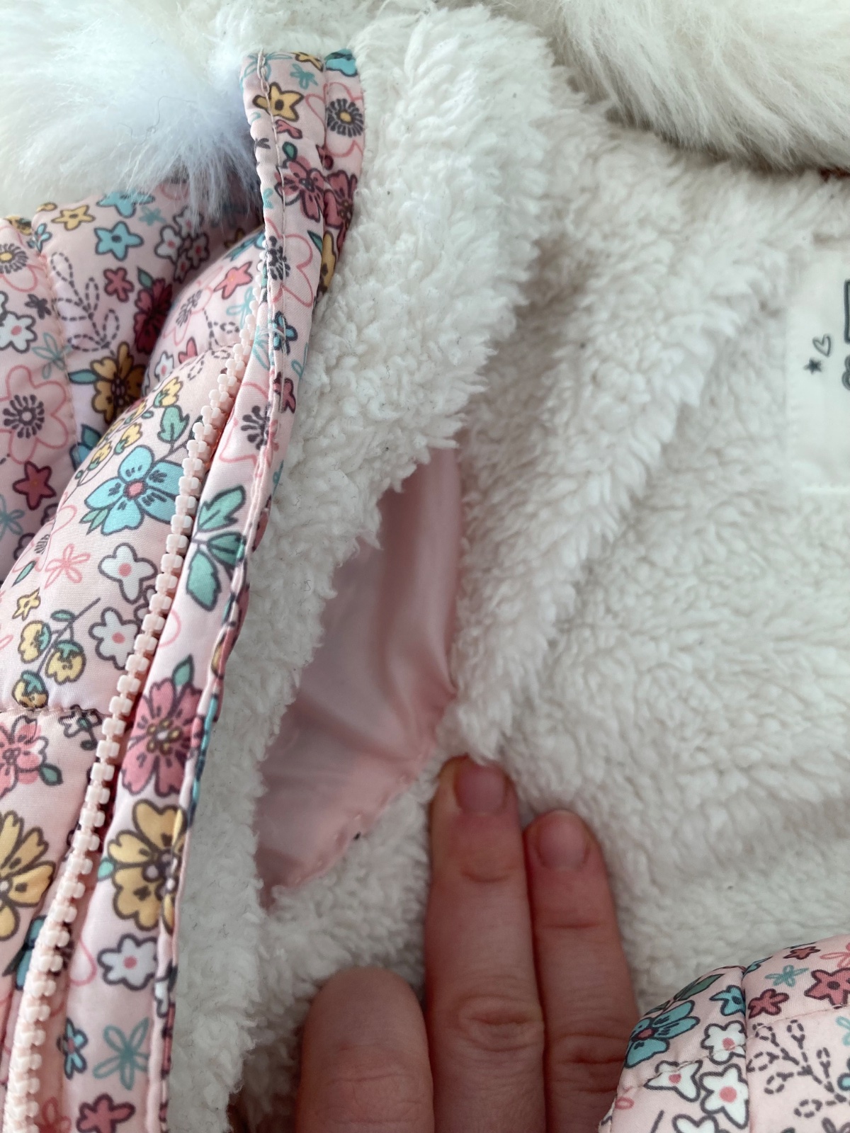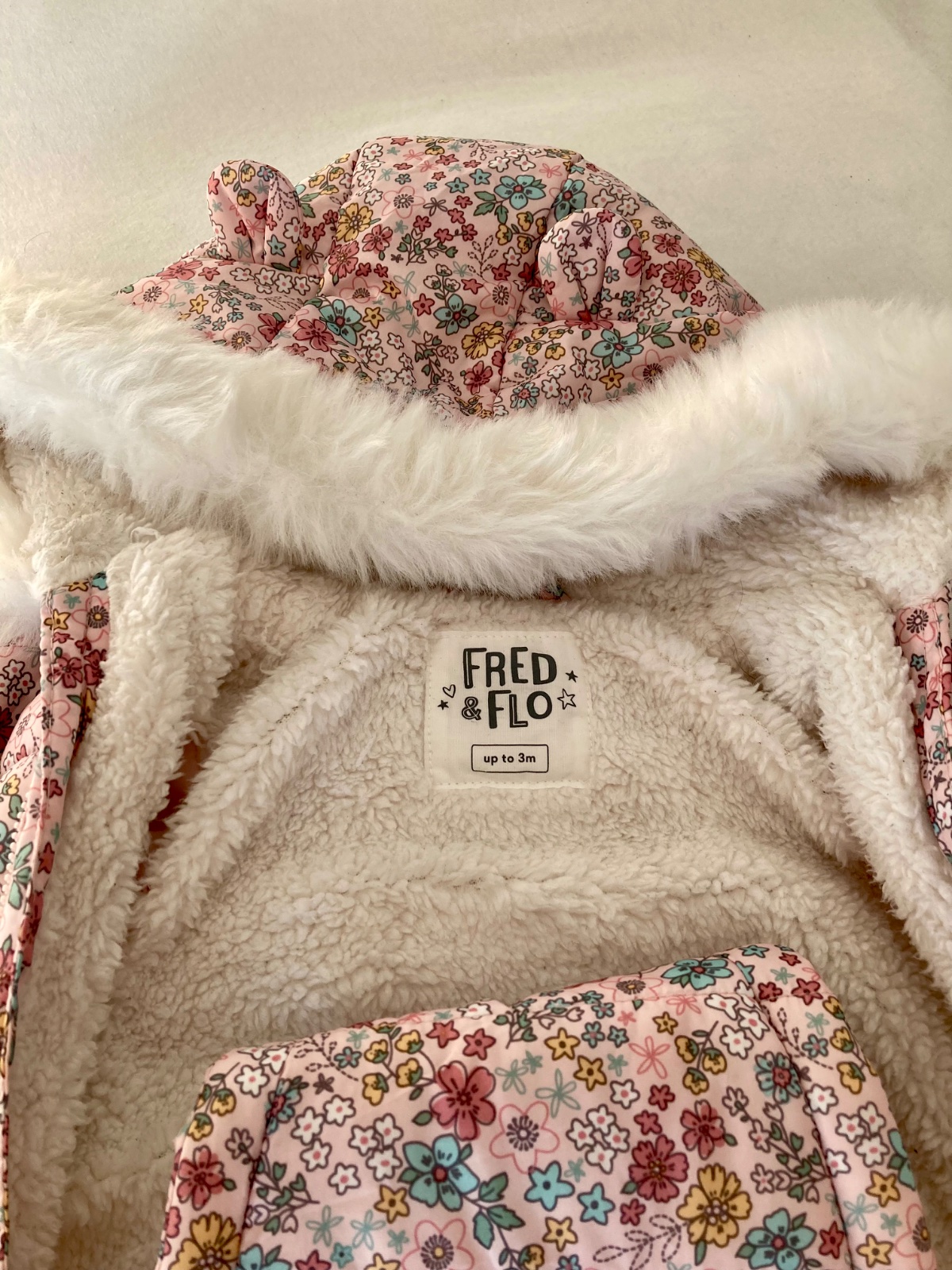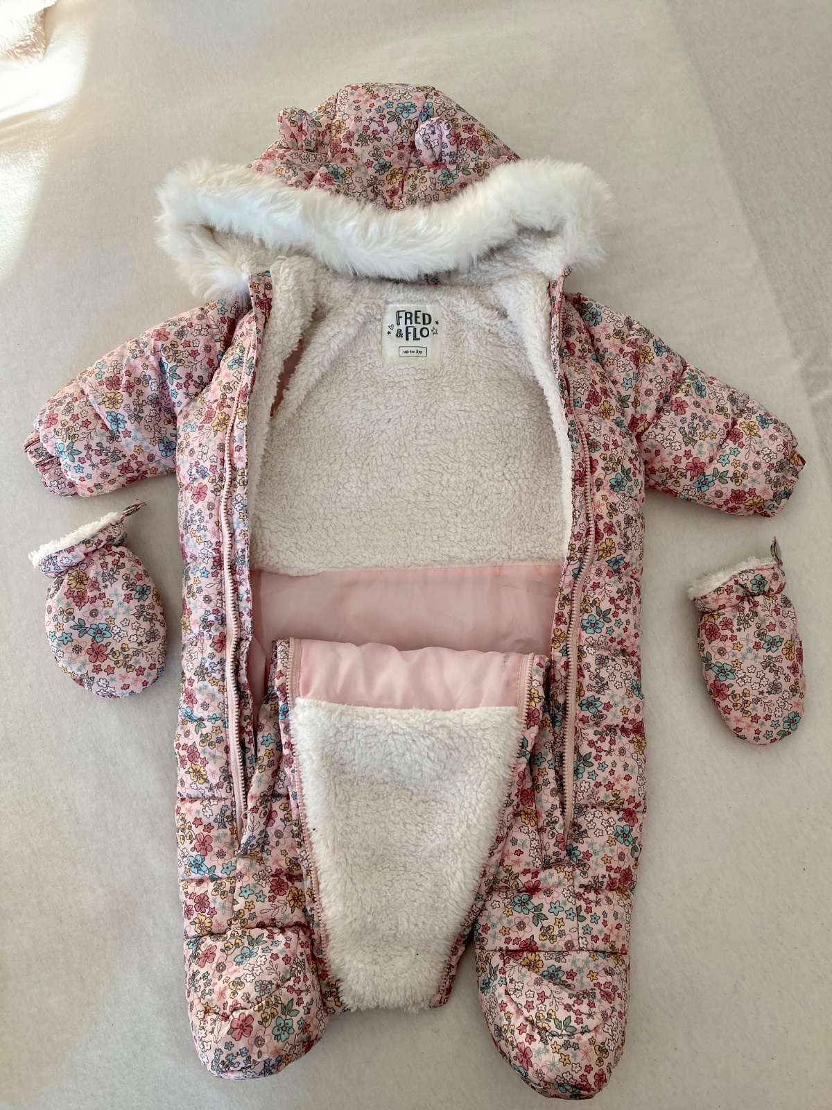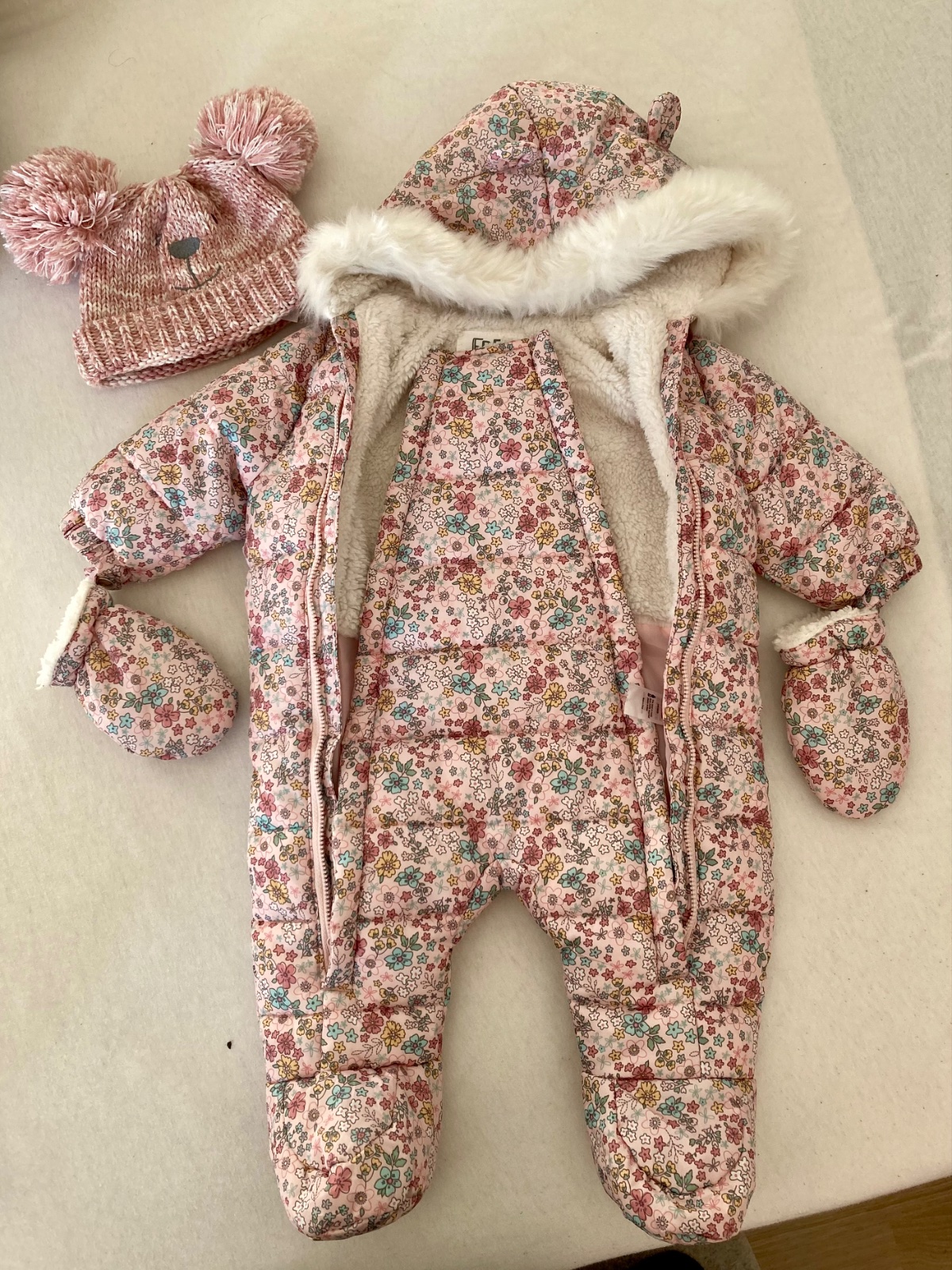 Ponúkam na predaj tento pekný kvetinkový zimný overalik. Veľkosť písana up to 3m, teda 62. Majú aj rukavice, čiapku dávam ako grátis :) Top stav, žiadne poškodenie nemá, iba z vnútra v podpazuší bola trošku zošitá, ale keď neviete o tom vôbec to nevidno