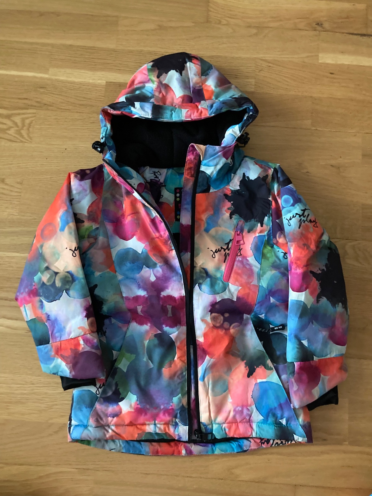 Malo nosena bunda do snehu, bez poskodeni. Vo vnutri ma flisovu mikinu s ktorou je spojena zipsom. Kapucnu je mozne odobrat (zips).