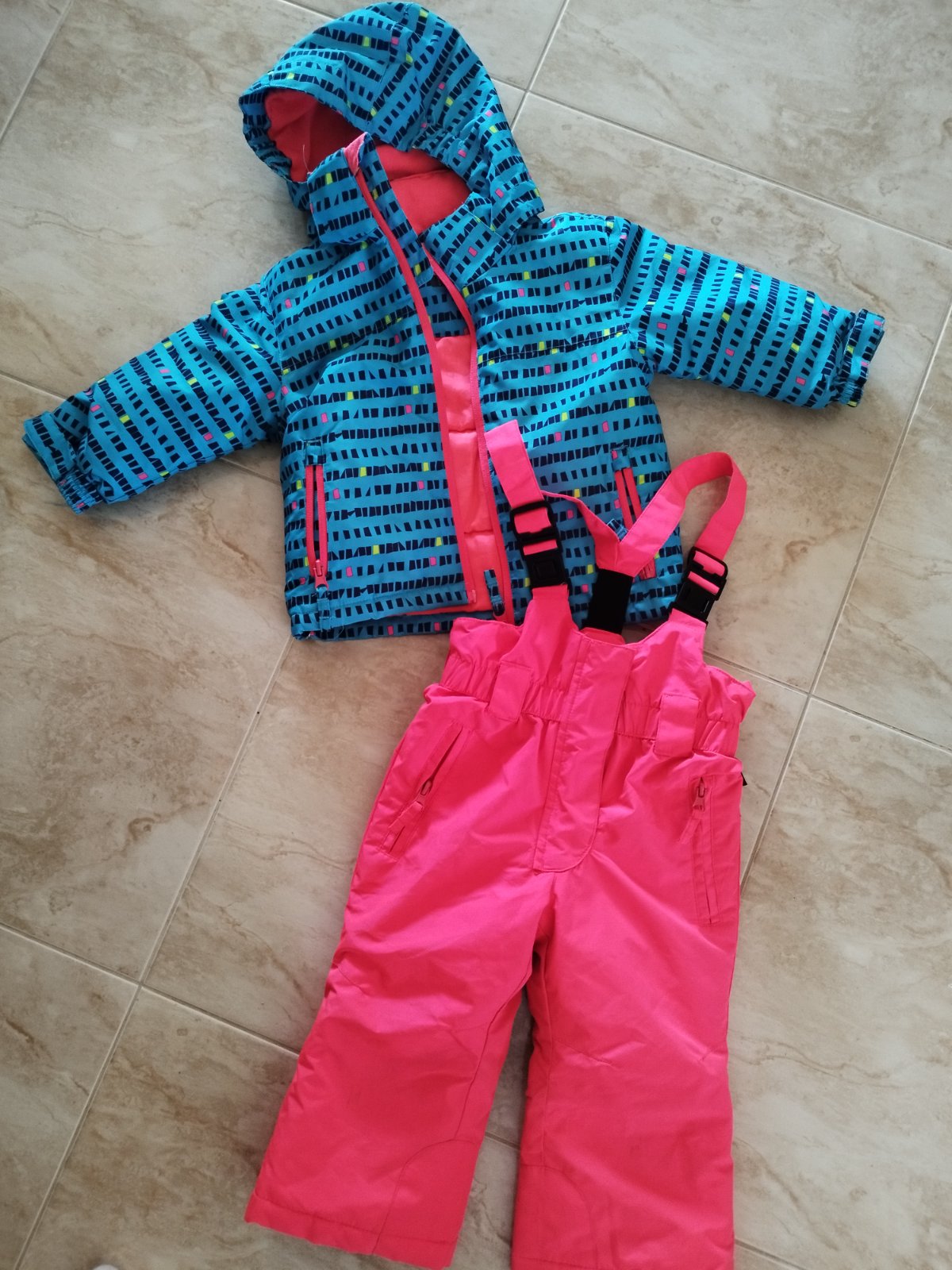 Úžasná zimná lyžiarska súprava. Tenká, napriek tomu hrejivá. Rukávy bundičky sú jemne zatrhnuté. Na oteplovačkách sú 2 mini bodky, ktoré sa nepodarilo vyprať. Taktiež aj na 1 rukáve je drobný fliač...
