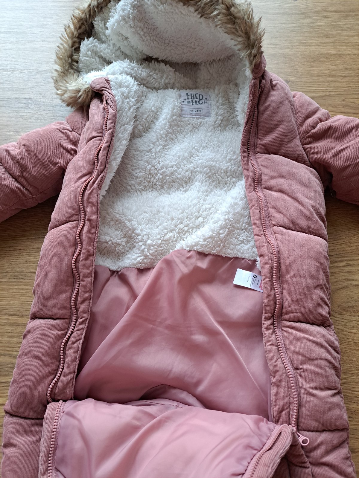 Teplý overal, kombinéza. Ľahké obliekanie vďaka dlhému zipsu až k nožičke, rúčky sa dajú vyhrnúť, alebo schovať vďaka všitym rukavičkám Z vnútornej strany vyteplený, viď foto. Veľkosť 62 s nozickam...