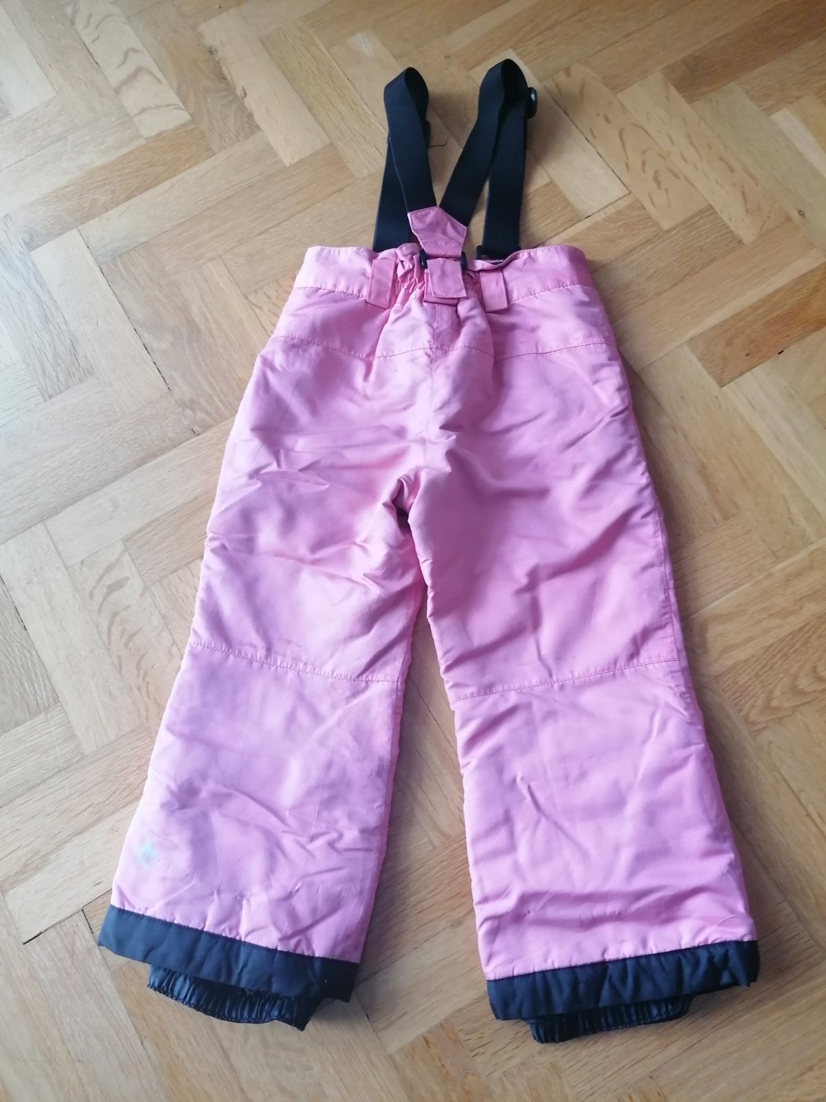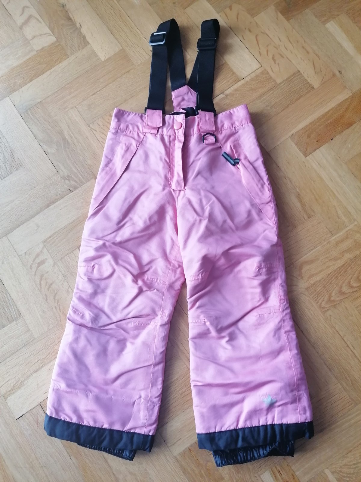 Teplé lyžiarske nohavice do snehu, na nastaviteľné traky, v spodnej časti patent. Nosené málo, nepoškodené. Veľkosť 98/104, dĺžka 60cm, vnútorná dĺžka 40cm, pás 2x28 až 2x32cm.
