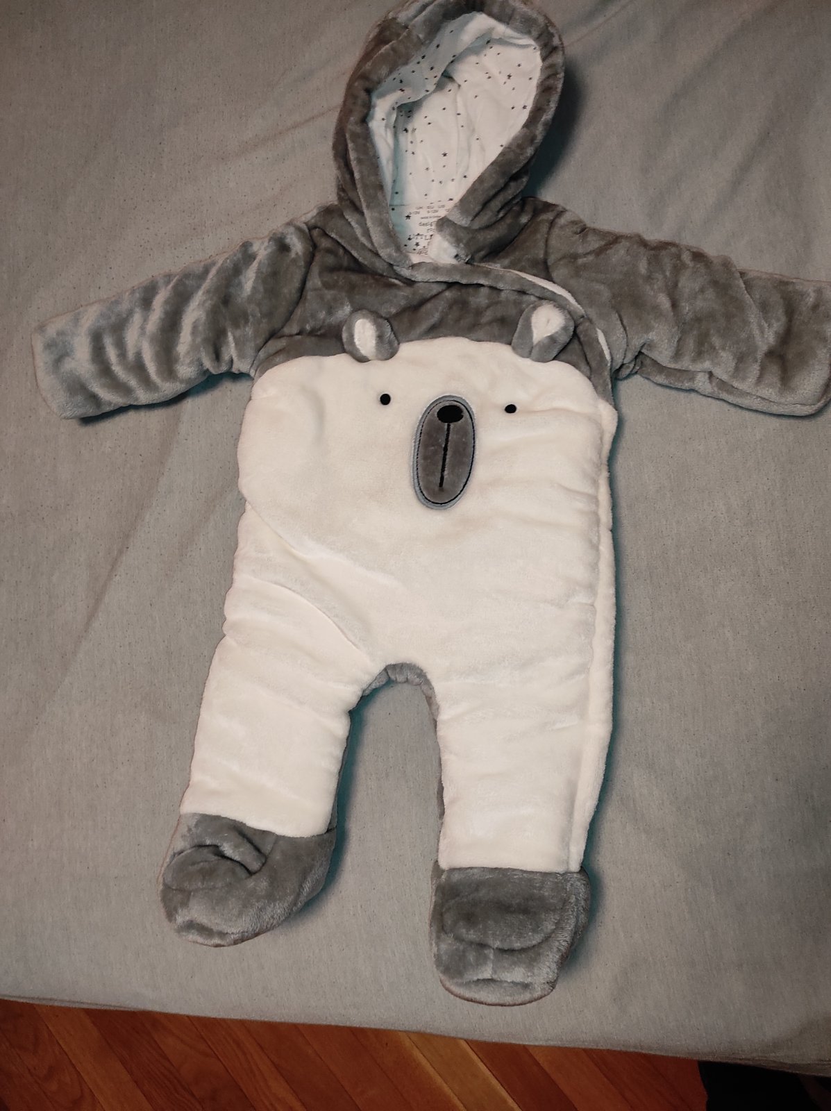 Biely/šedý hrubý zimný overal (80-86, 9-12 mesiacov). Málo používaný, len na spanie v kočíku v zime.