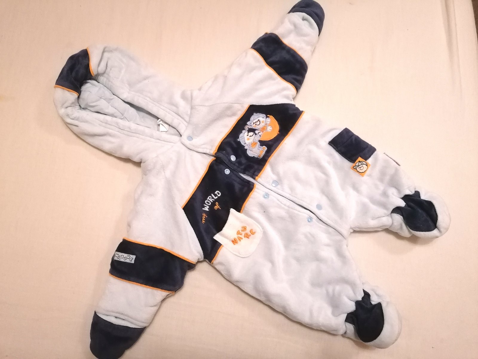 Kombinéza pre malé bábätko. Dĺžka je 50 CM. Není uvedená veľkosť. Premeriam na požiadanie. Vo vnútri biela látka. Zips je na ľavej nízke prešity aby sa neotváral, jemne zmolky na rukávoch.