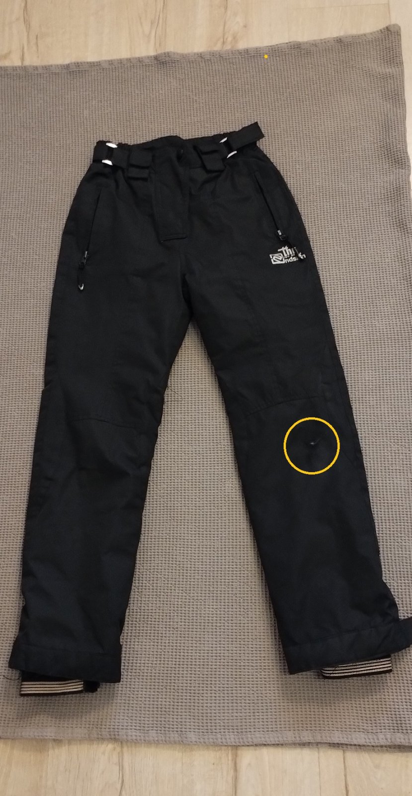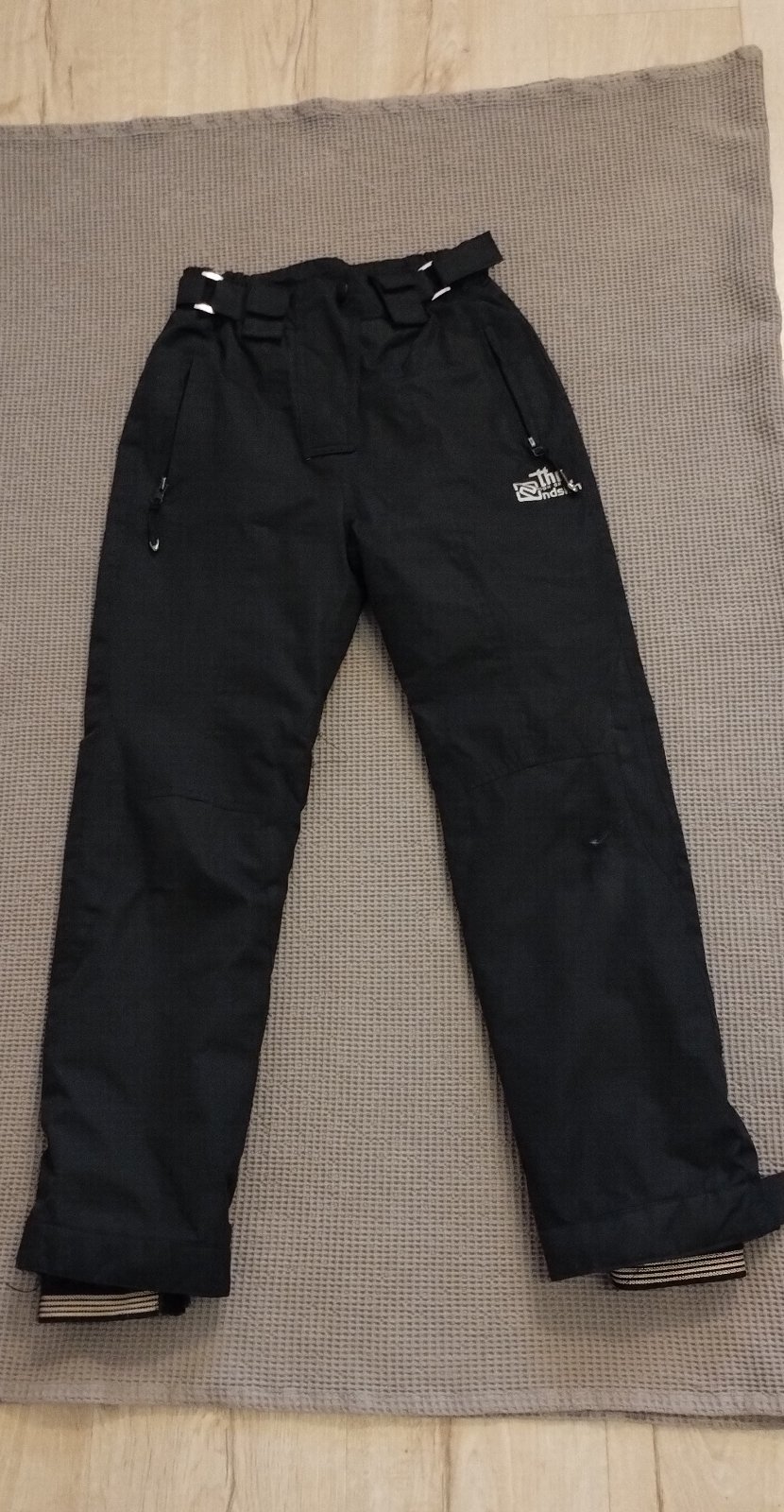 Čierne oteplovačky zn. Noskin, rozmery: pás vkľude 29cm ale natiahne sa podľa potreby, po obidvoch stranách je nariasená guma ktorá sa buď roztiahne alebo sa dá ešte patentom na suchý zips utiahnuť a prispôsobiť tak pás...dĺžka 90cm plus ešte guma na topánky, ktorú som nemerala. Oteplovačky sú kúsok roztrhnuté na kolene, sú však ďalej použiteľné napr. na korčulovanie. Nenáročnej mamičke pribalím na vyžiadanie k nákupu.