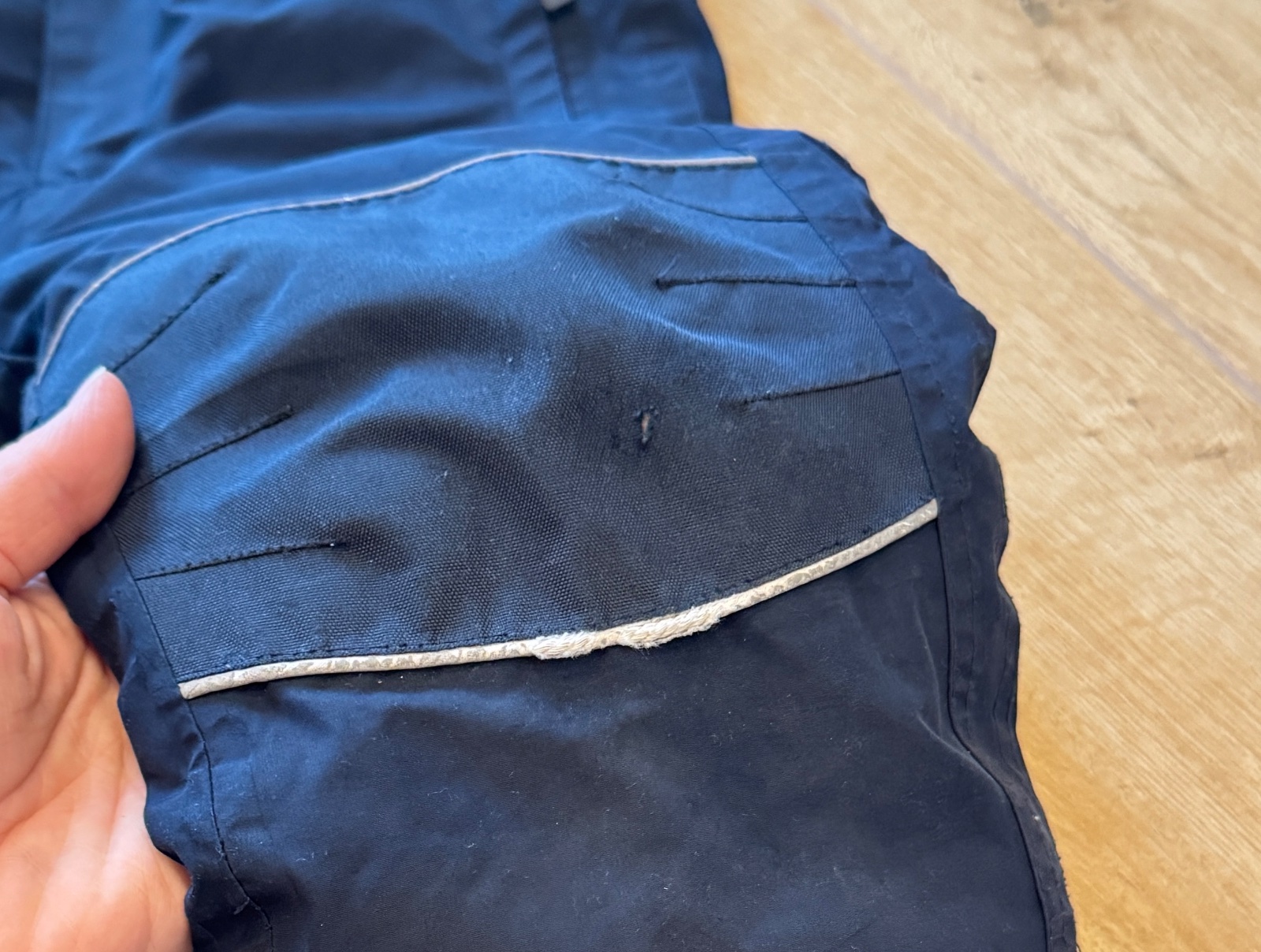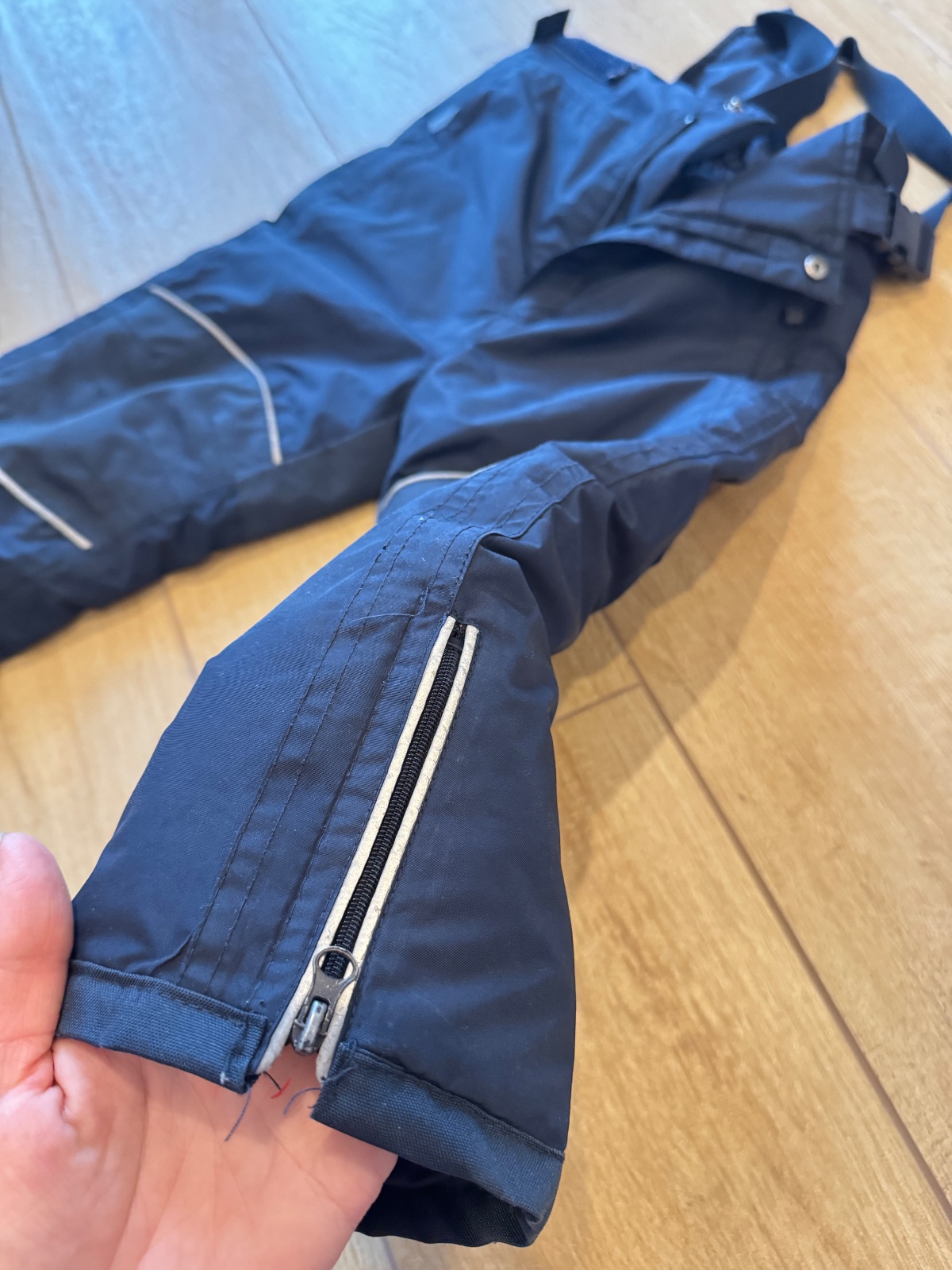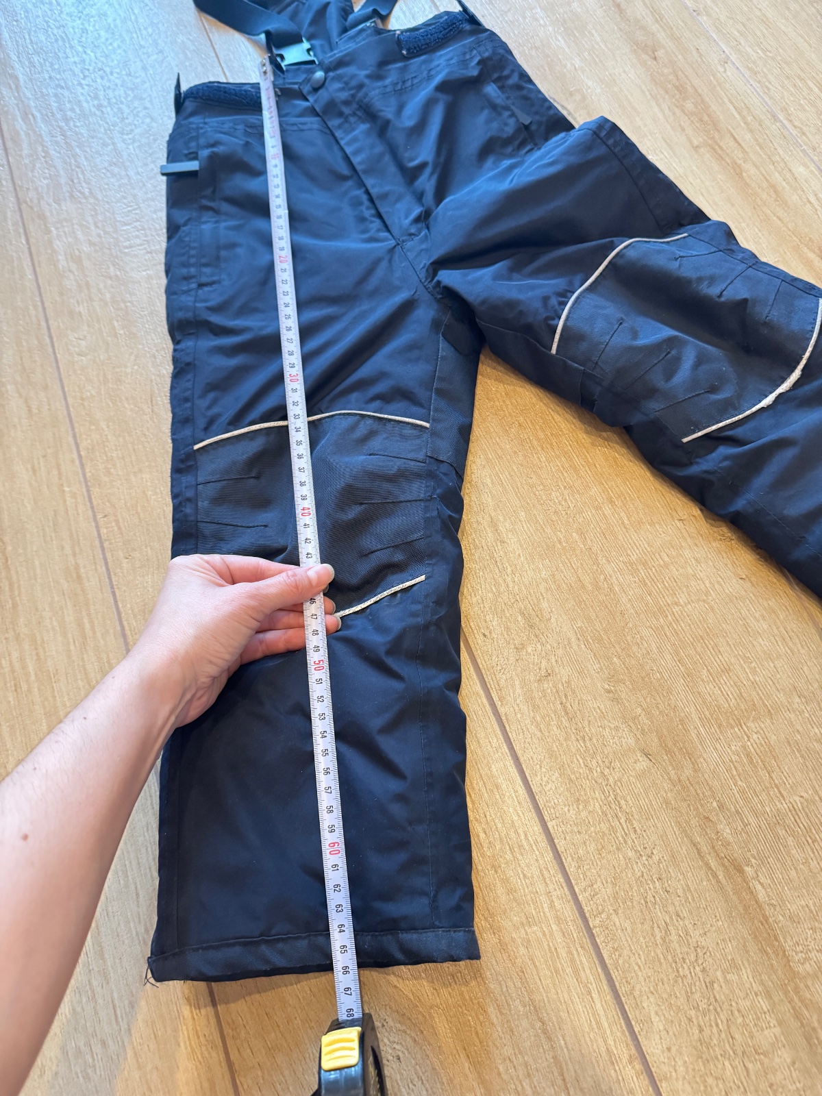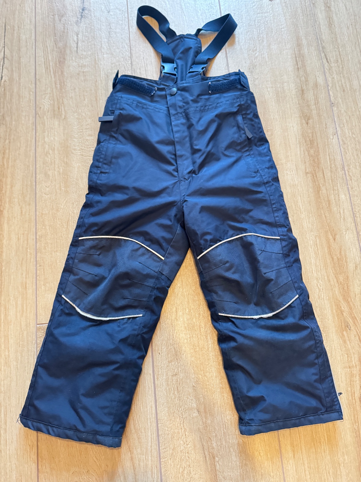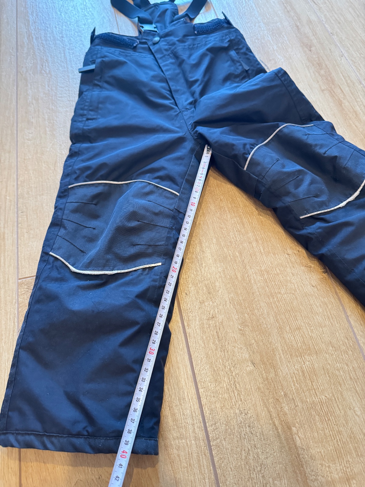 Lyžiarske nohavice, otepľovačky do snehu. Teplé, na traky, nastaviteľná dĺžka trakov, aj v páse, zosilnené na zadku a na kolenách. Na kolenách úplne minú dierka - viď foto.