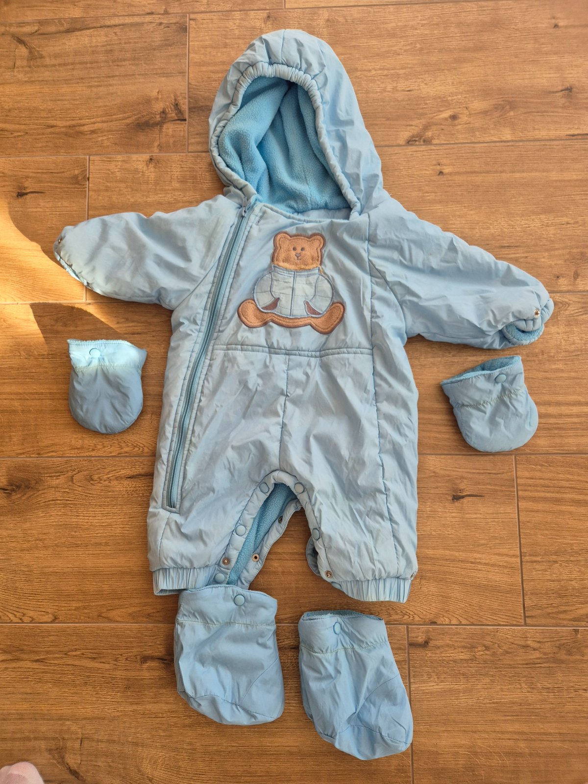 Krásny zimný overal - papučky možno odopnúť, ak chcete dať topánočky. Taktiež, aj rukavičky možno odopnúť. Overal je bez poškodenia. Ako darček: zimná čapička.