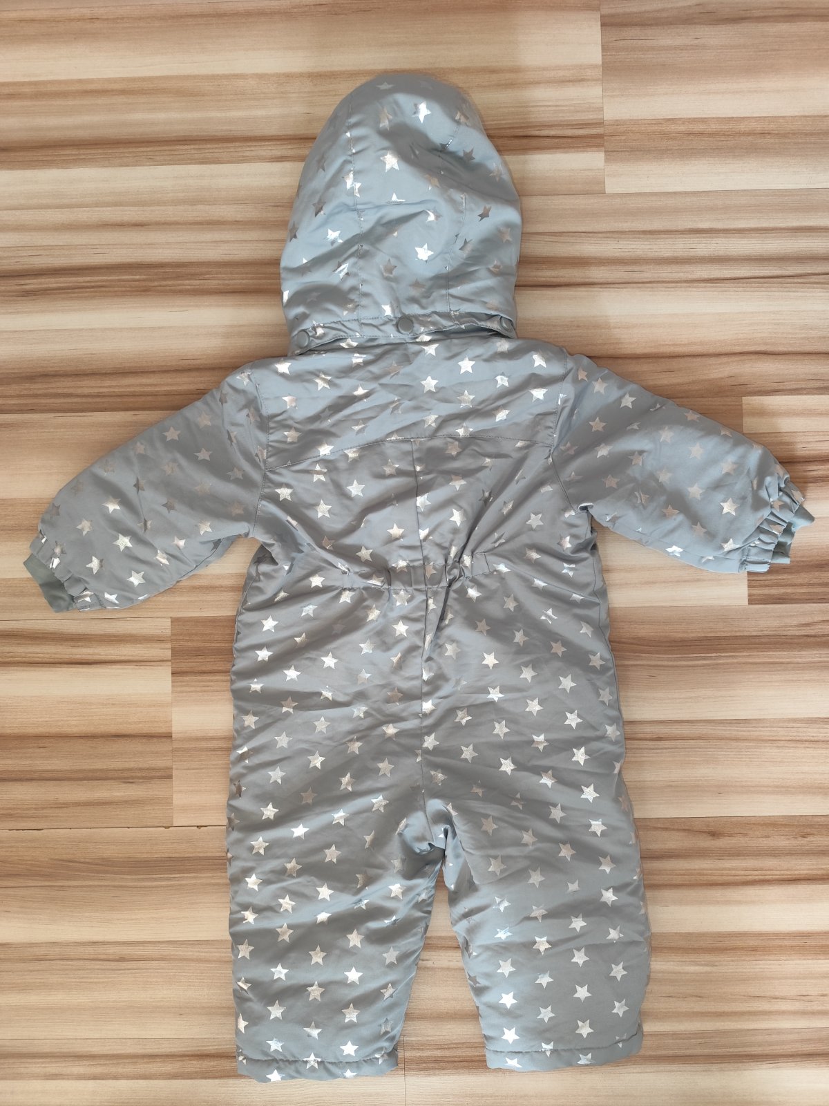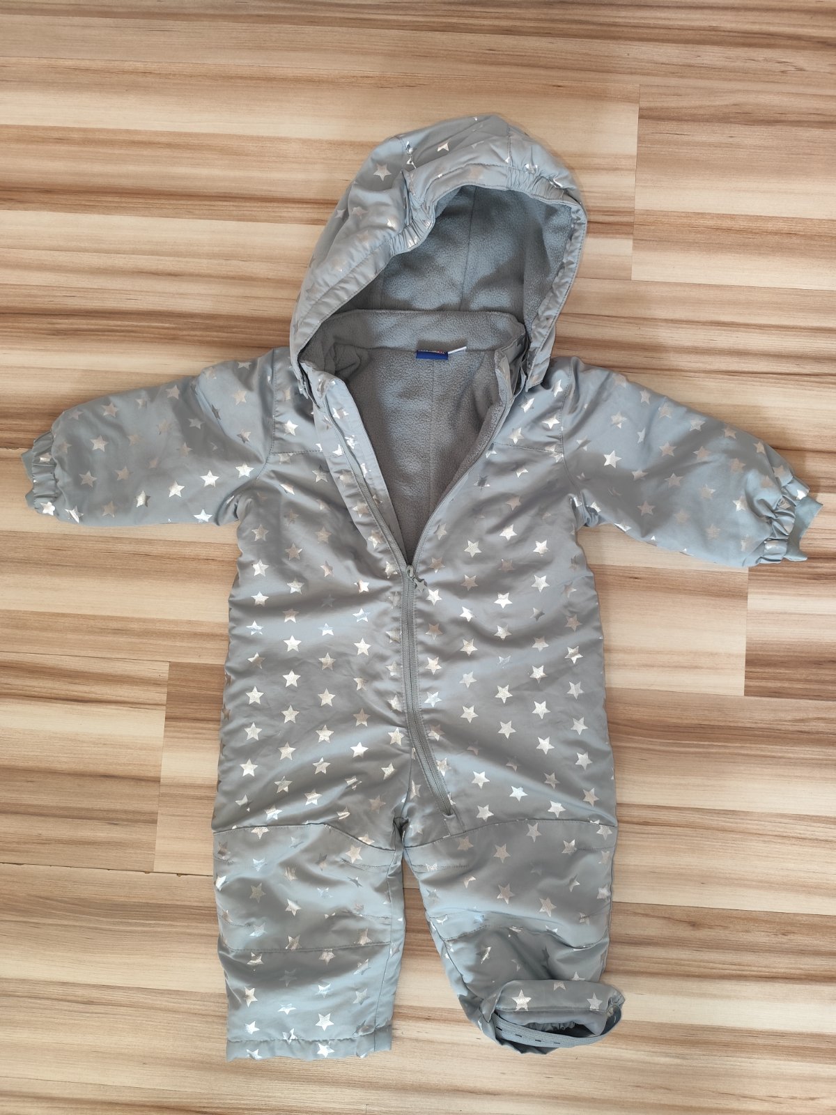 Kombinéza s otvorenými nožičkami v dvojveľkosti 74/80 v top stave. Kapucňa je odopínateľná, na patenty. Vnútro zateplené fleecom.