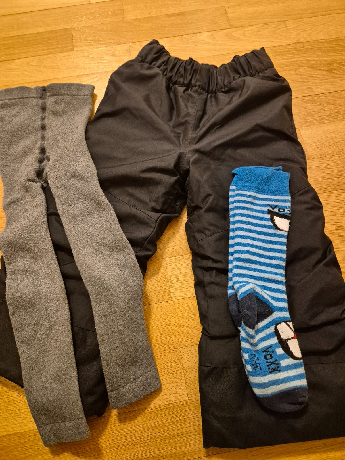 Oteplovacky v peknom nosenom stave. K tomu thermo leginy zn.Tchibo vel.98/104 ( zmolky z prania) ale inak bez poskodenia. Ak by bol zaujem predam aj ponozky do lyziarok /korcul zn.Vox vel. 20- 24 ( nosene,v peknom stave bez poskodeni) Cena za ponozky 1.50€