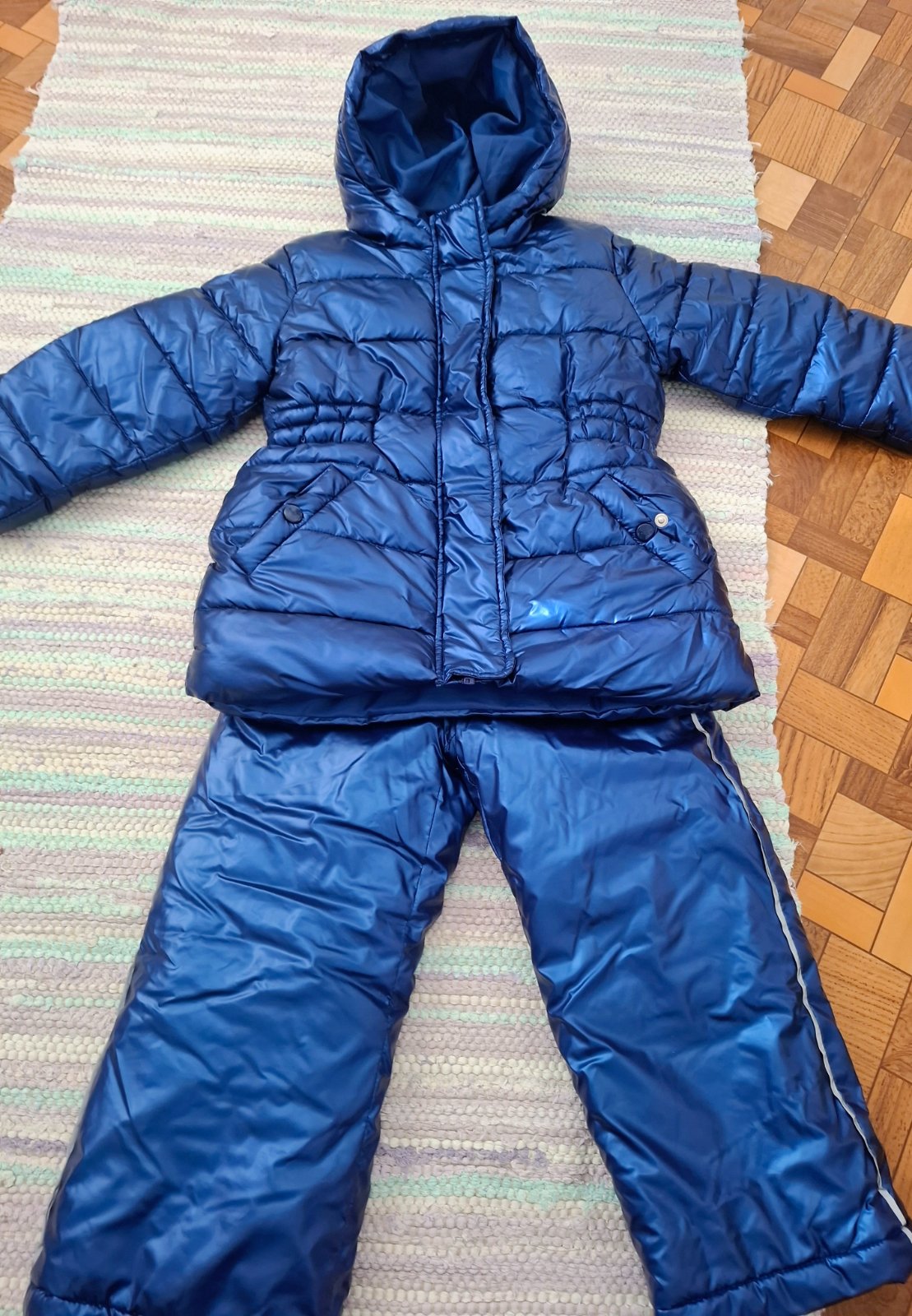 Zimná súpravka Bunda má odopínaciu kapucku, super stav Otepľovačky sú tmavomodré rovnako ako bundička len je každé fotené pri inom svetle Otepľovačky majú trošku zatrhnutie nič strašné Cena za ...