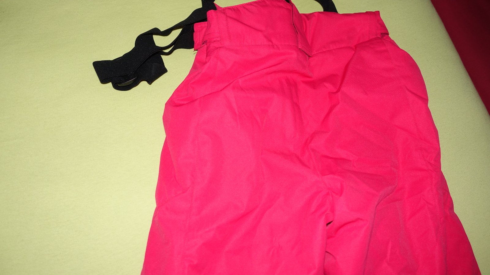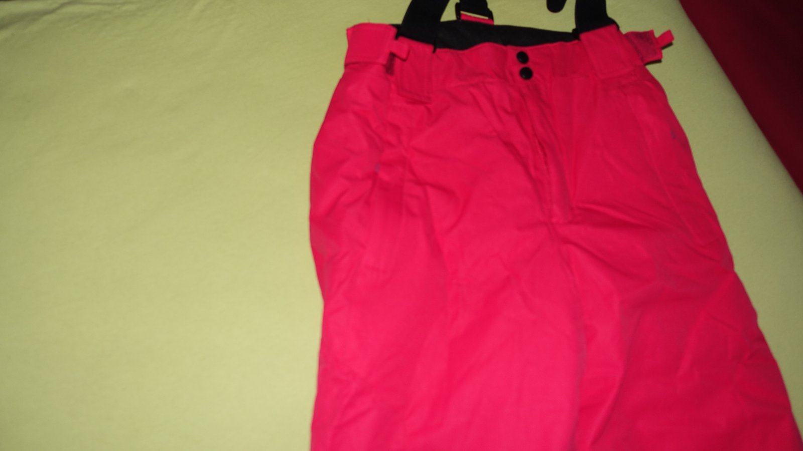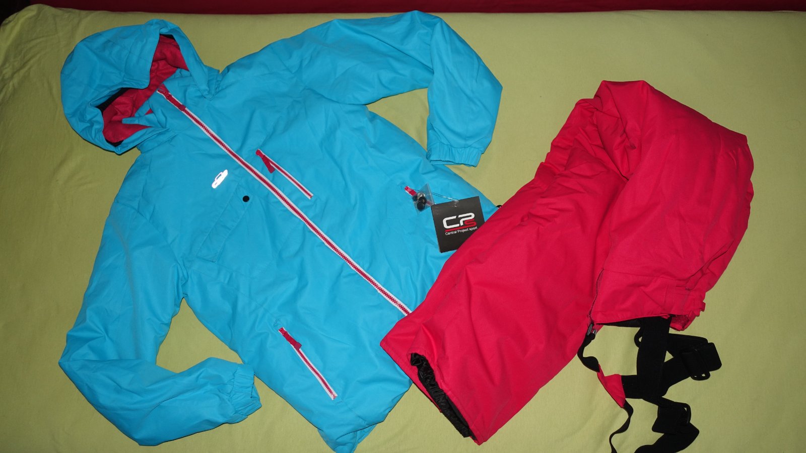 Krasna supravana na lyzovanie- nova, s visackami. Kapucna sa da odopnut. Traky na oteplovackach su odnimatelne a posuvne.